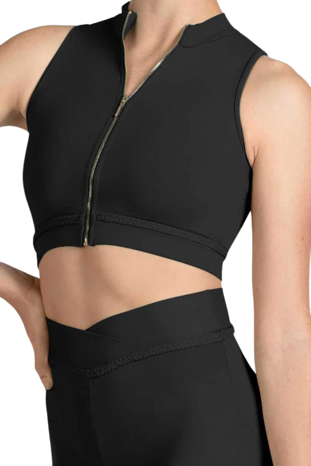Our Ladies Mirella Miami Zip Front Crop Top features a cropped length with a high neck and a golden zip front closure for a secure fit. Pair with our V Front Short or V Front Jazz Pant for your perfect dance ensemble. Part of our Mirella Miami Collection; showcasing intricately braided trims, elegant mesh panels, and golden hardware. The collection boasts a striking palette, injecting South Beach glamour into your dance attire.