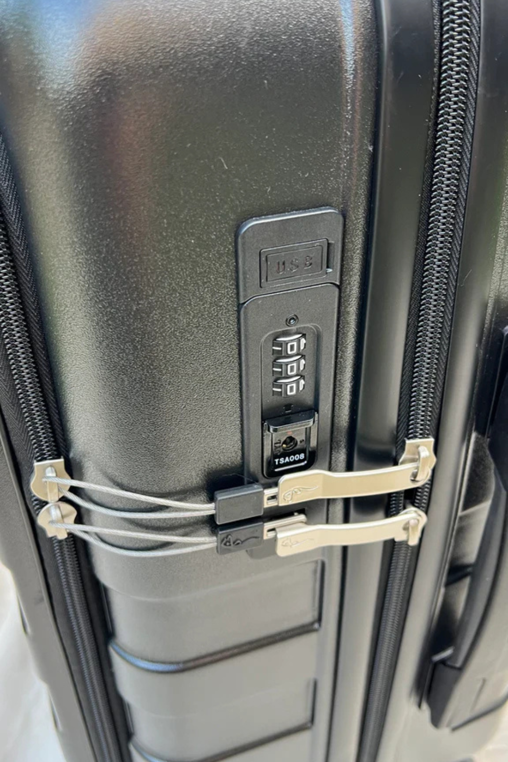 • TSA Compliant Lock with USB Port (must use your own portable battery pack, not included)
