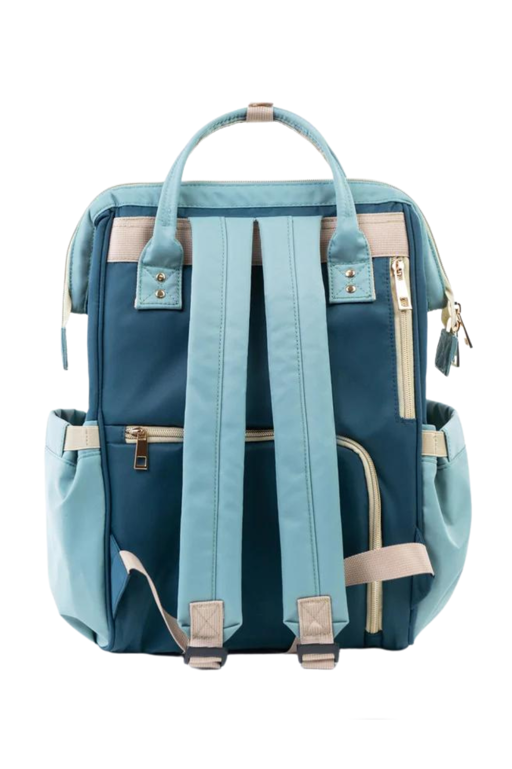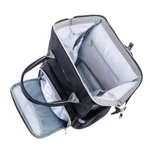 • On the outside of the bag, the front features a large, zippered compartment that contains an insulated snack pocket; while the back features a zippered cell phone pocket; and a rear zipper that has access to the main compartment.