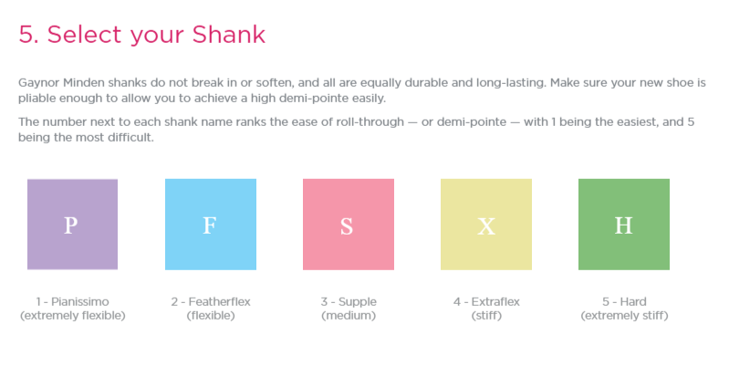 Gaynor Minden shanks do not break in or soften, and all are equally durable and long-lasting. Make sure your new shoe is pliable enough to allow you to achieve a high demi-pointe easily.