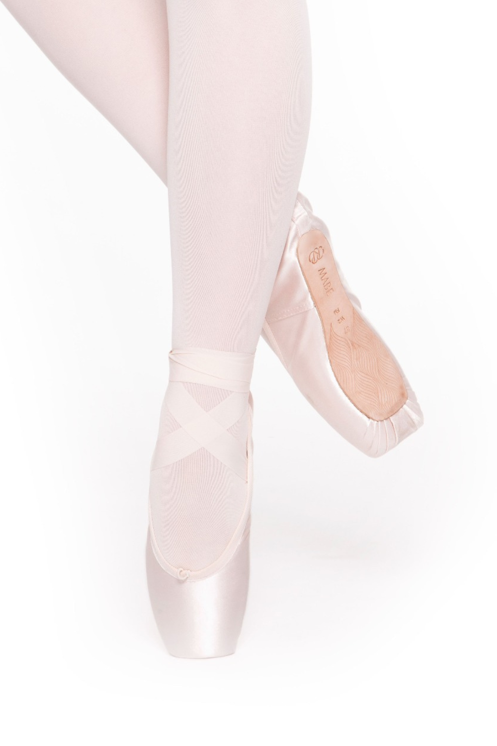 Look no further than this pearl-inspired pointe shoe for your perfect fit. Mabe pointe shoes are included in the NEW Sea of Pearls Collection. Featuring pliable shanks, pre-arched construction, generous box, medium crown and an extra-wide toe platform. Dancers most likely to choose Mabe have broad or even-length toes or wear thicker padding, such as gel pads. This model does not have a significant difference in width from the metatarsal to the heel. Mabe is one of our roomiest shoes, fitting broader and more rectangular feet!