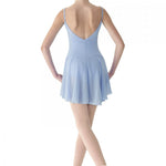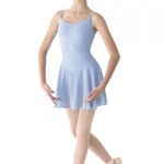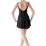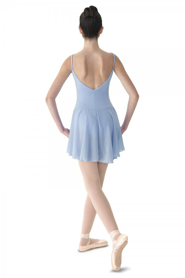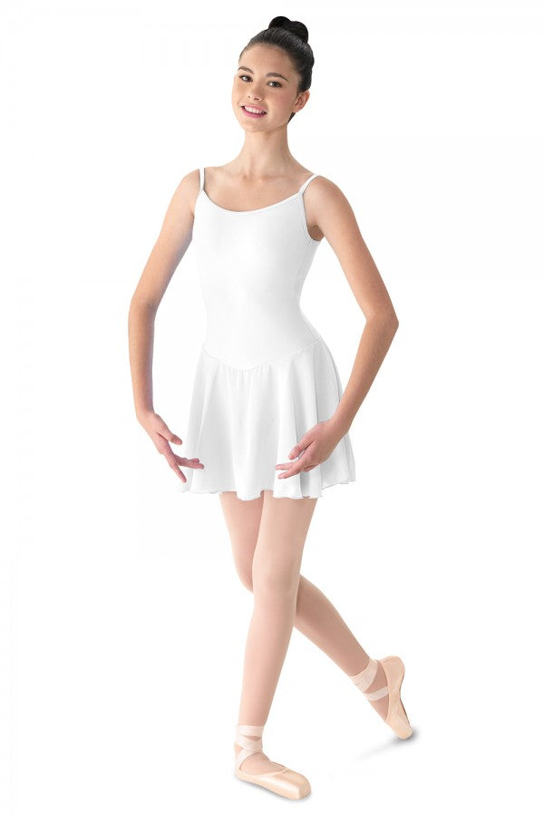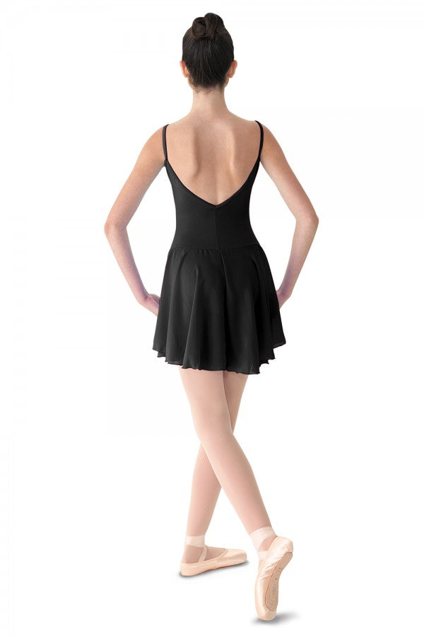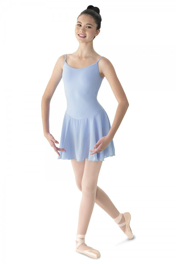 A recital and performance favorite for little dancers! This classic camisole leotard dress features a shelf-lined scoop front and low V back with an attached Georgette skirt in the same color that falls gently from the hip.