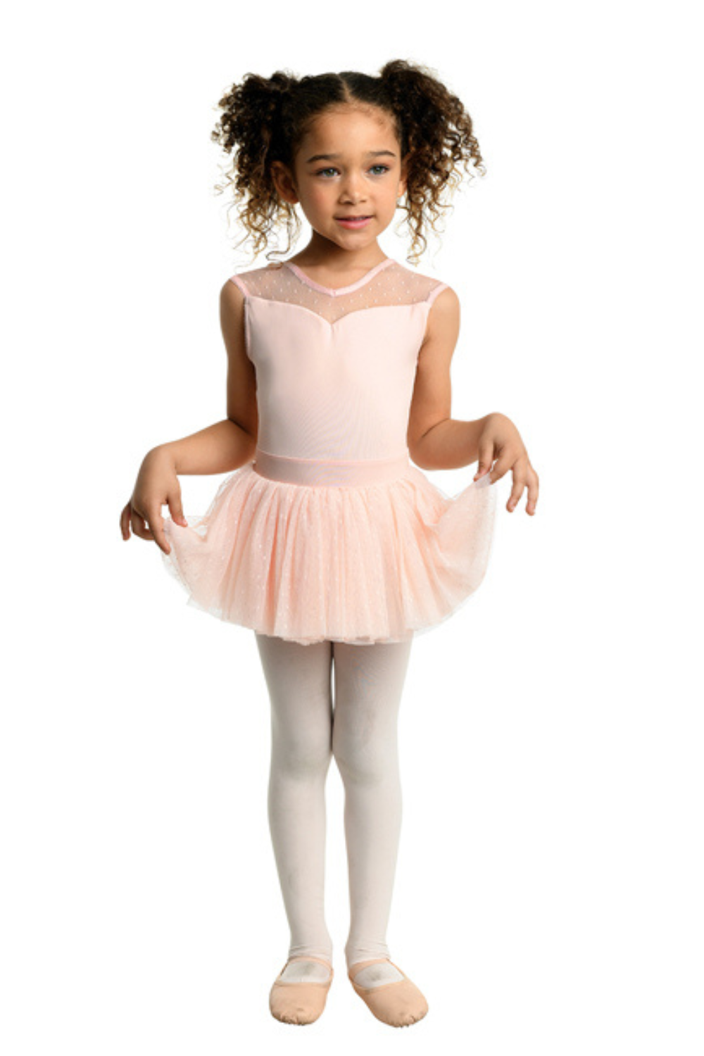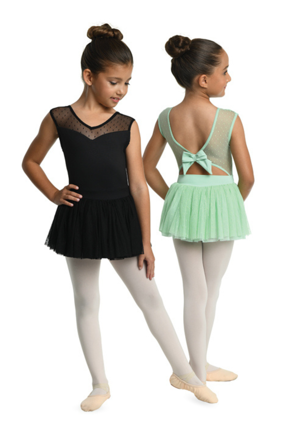 Beautiful cap sleeve skirted leotard with polka-dot mesh yoke and attached full volume tulle skirt.