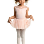 Beautiful cap sleeve skirted leotard with polka-dot mesh yoke and attached full volume tulle skirt.