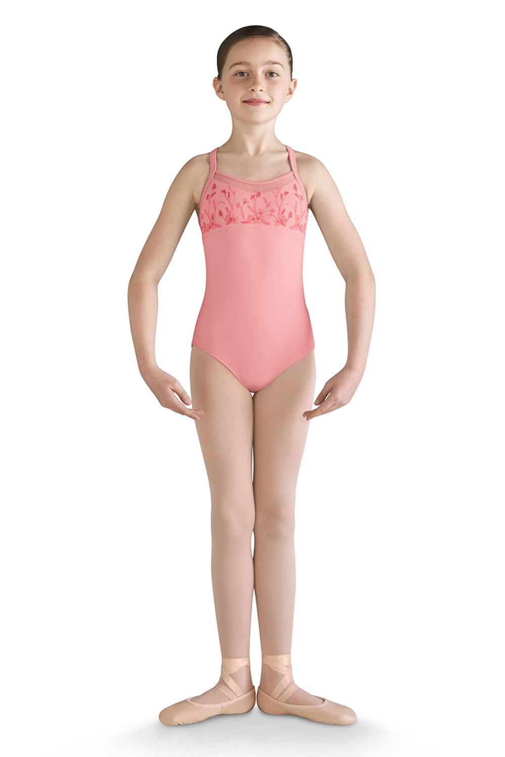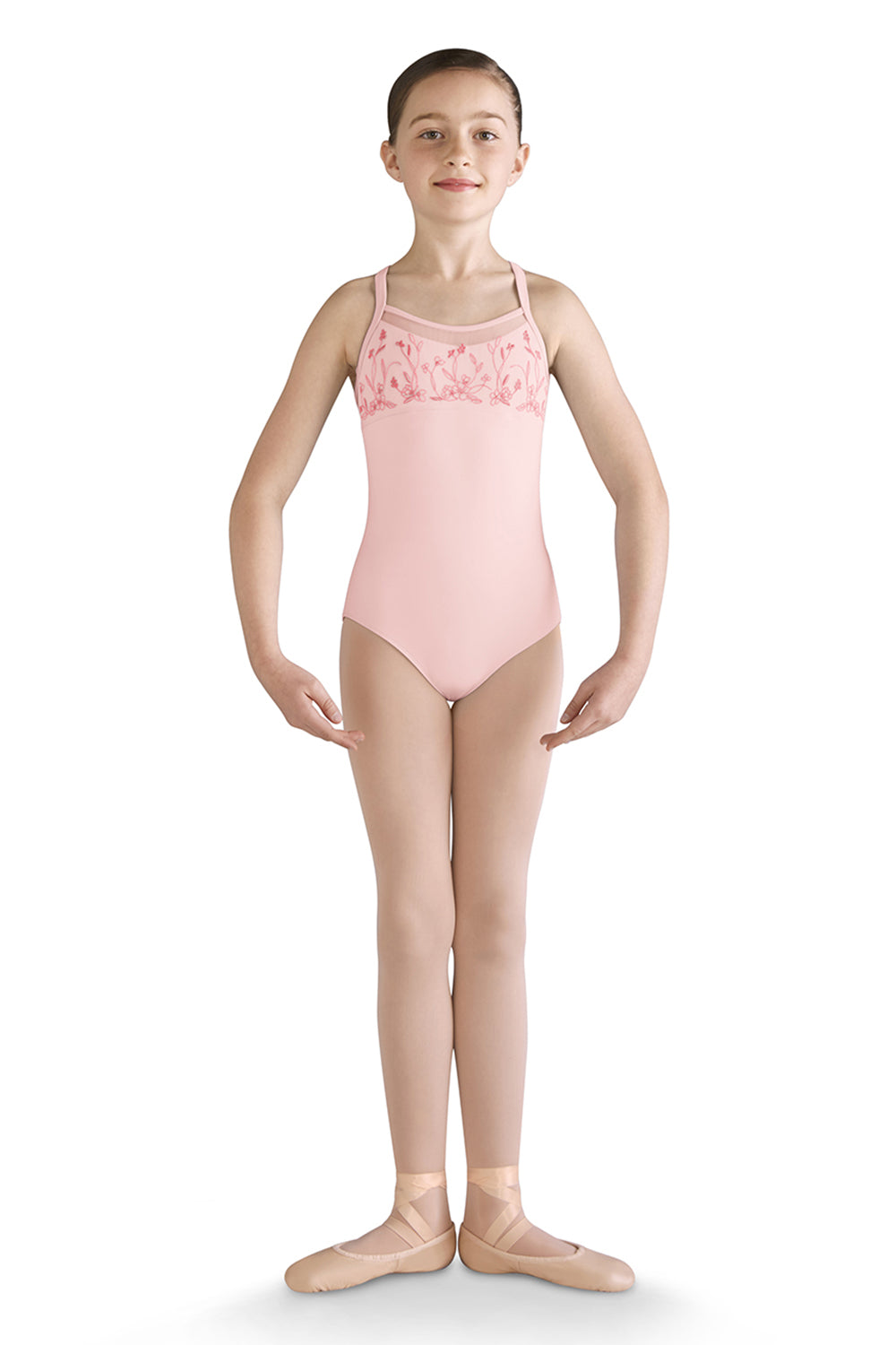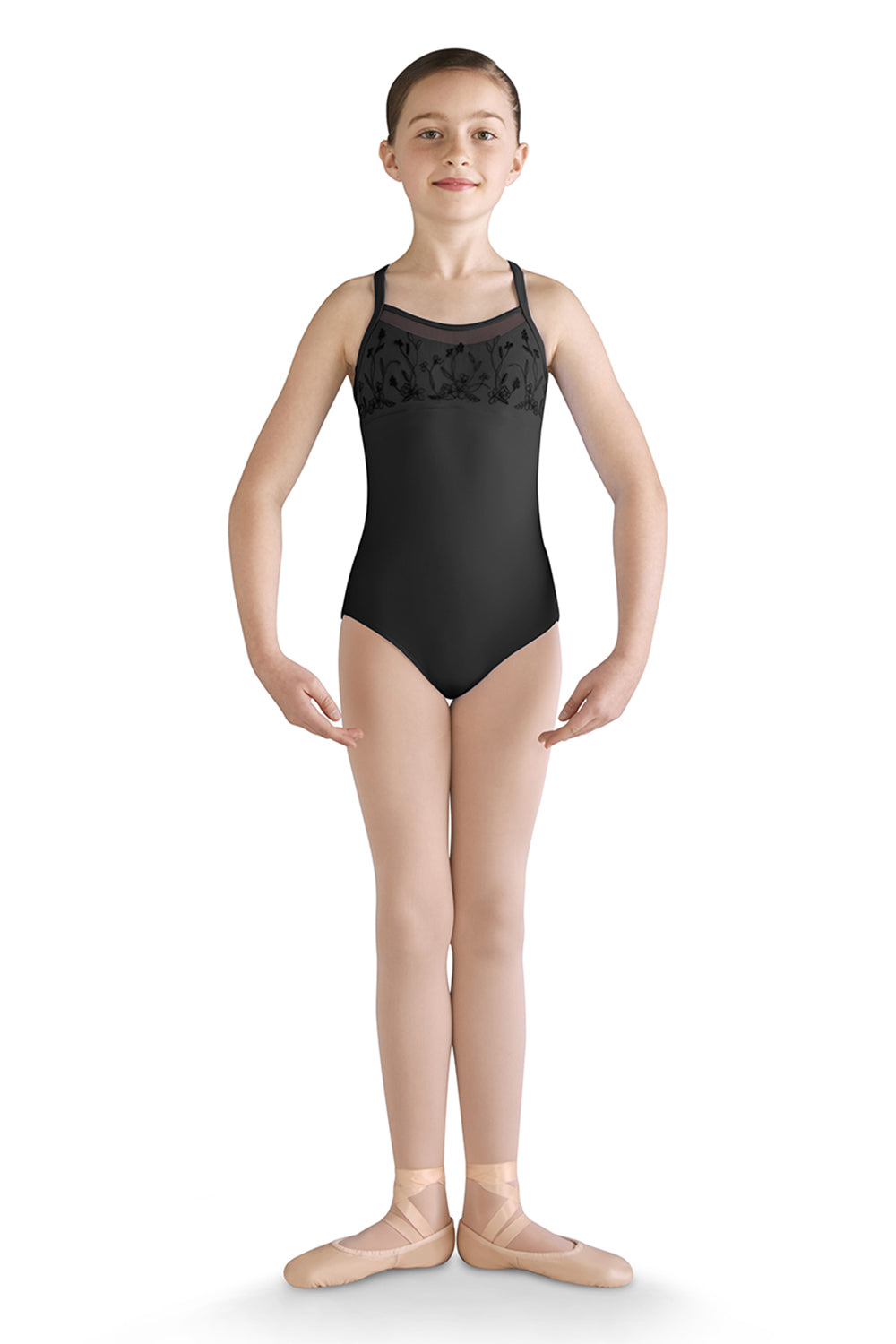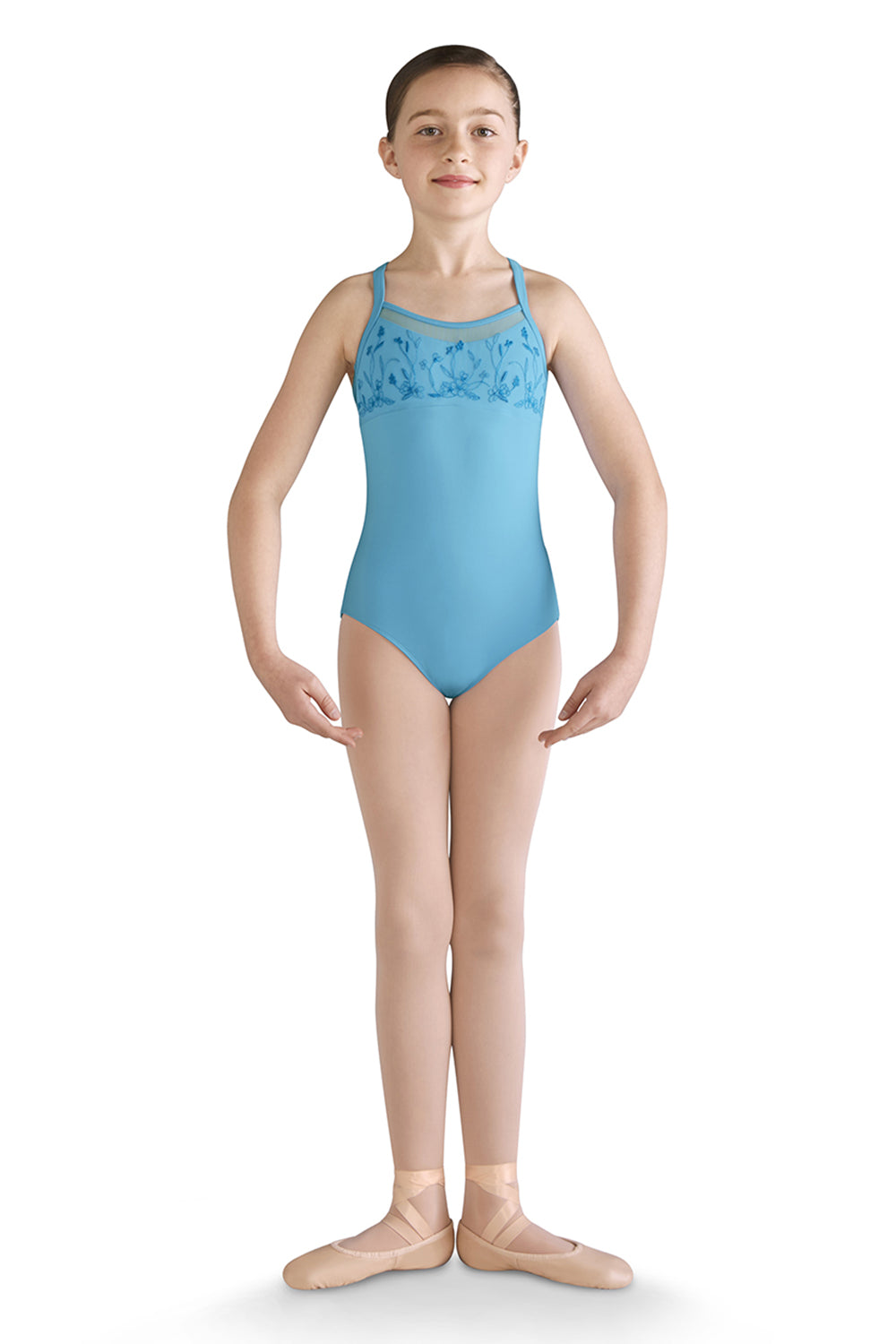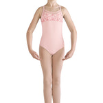 A traditional ballet style, this camisole leotard features an embroidered mesh bust overlay and empire waist line. Wide camisole straps continue into a racerback design connecting to a soft mesh back with center keyhole. Pair with a matching skirt for a classic ballet look.