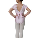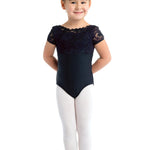 This adorable leotard features cap length lace sleeves with a scalloped lace ballet neckline, and low "V" back detailing.