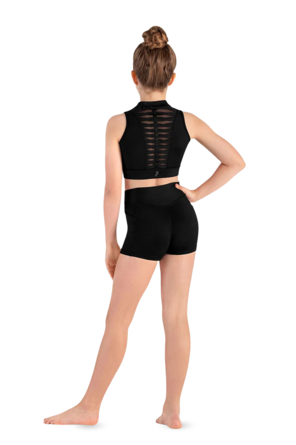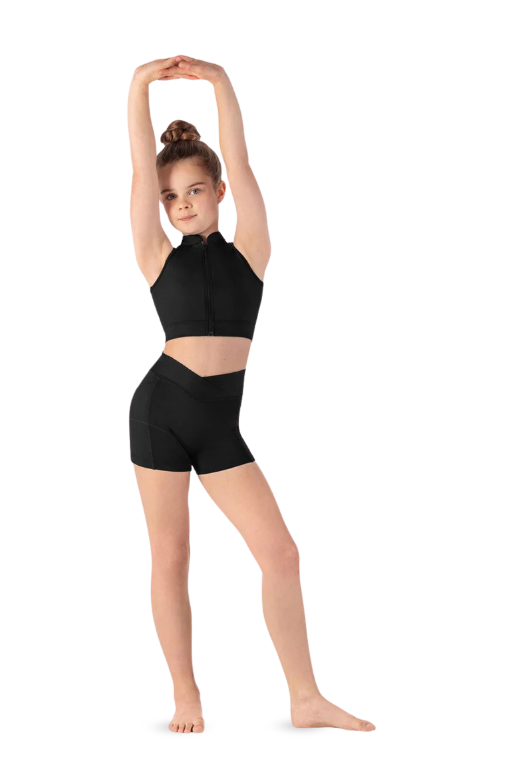 Our Girls Nicolia V Front Shorts feature a flattering cross over waistband, functional dual side pockets in a comfortable short length. Pair with our Jacky Zip Front Crop Top or Idalene Camisole Crop Top for your perfect dancewear look.