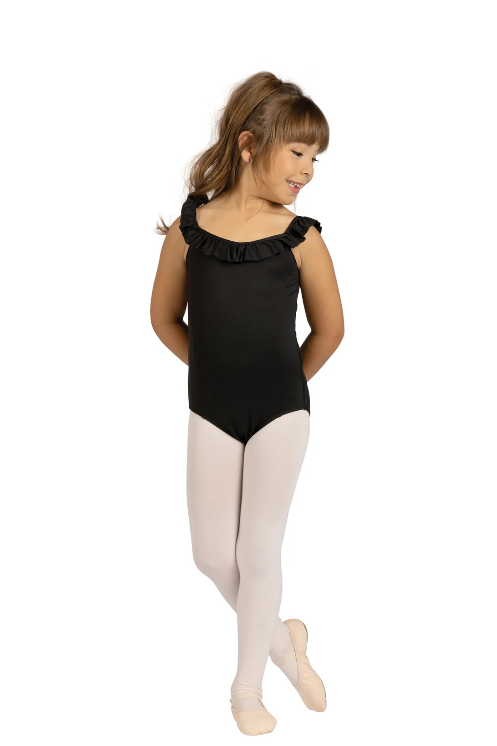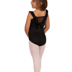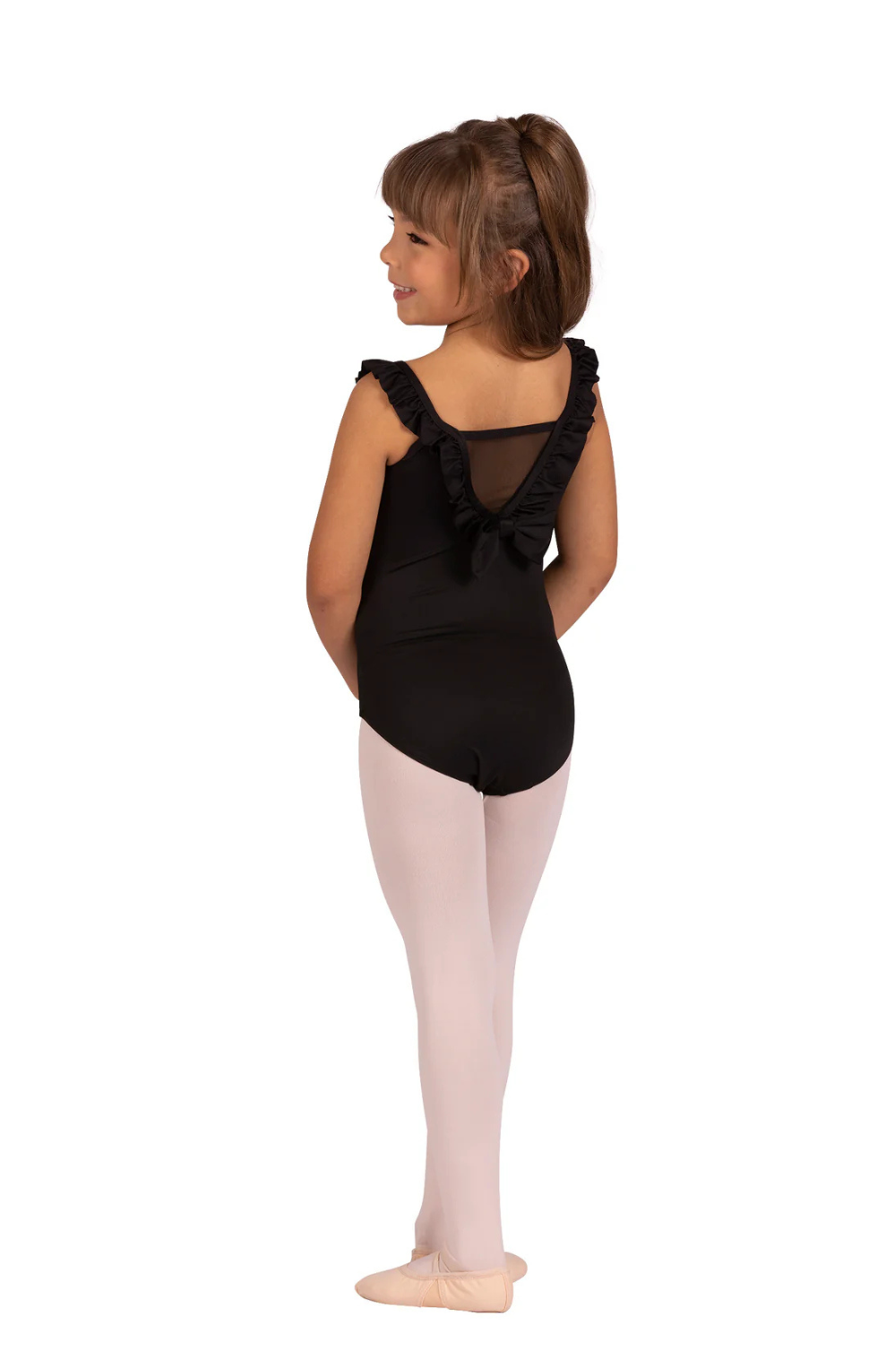 • Sleeveless leotard with ruffle trim at neck, features princess seams and mesh back insert with bow.