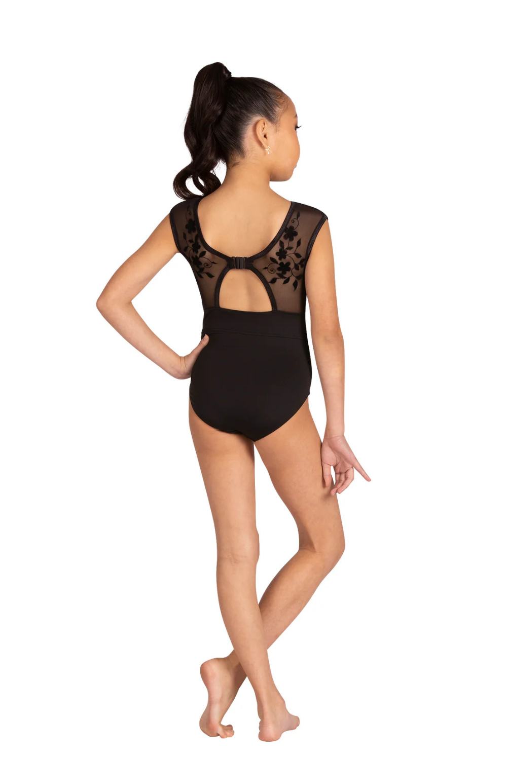• Wide shoulder tank leotard with raised floral print at mesh yoke and back.