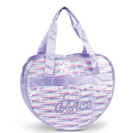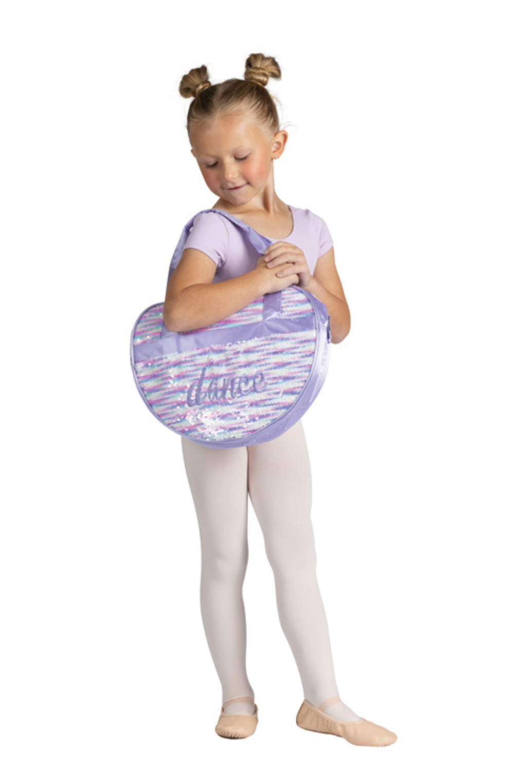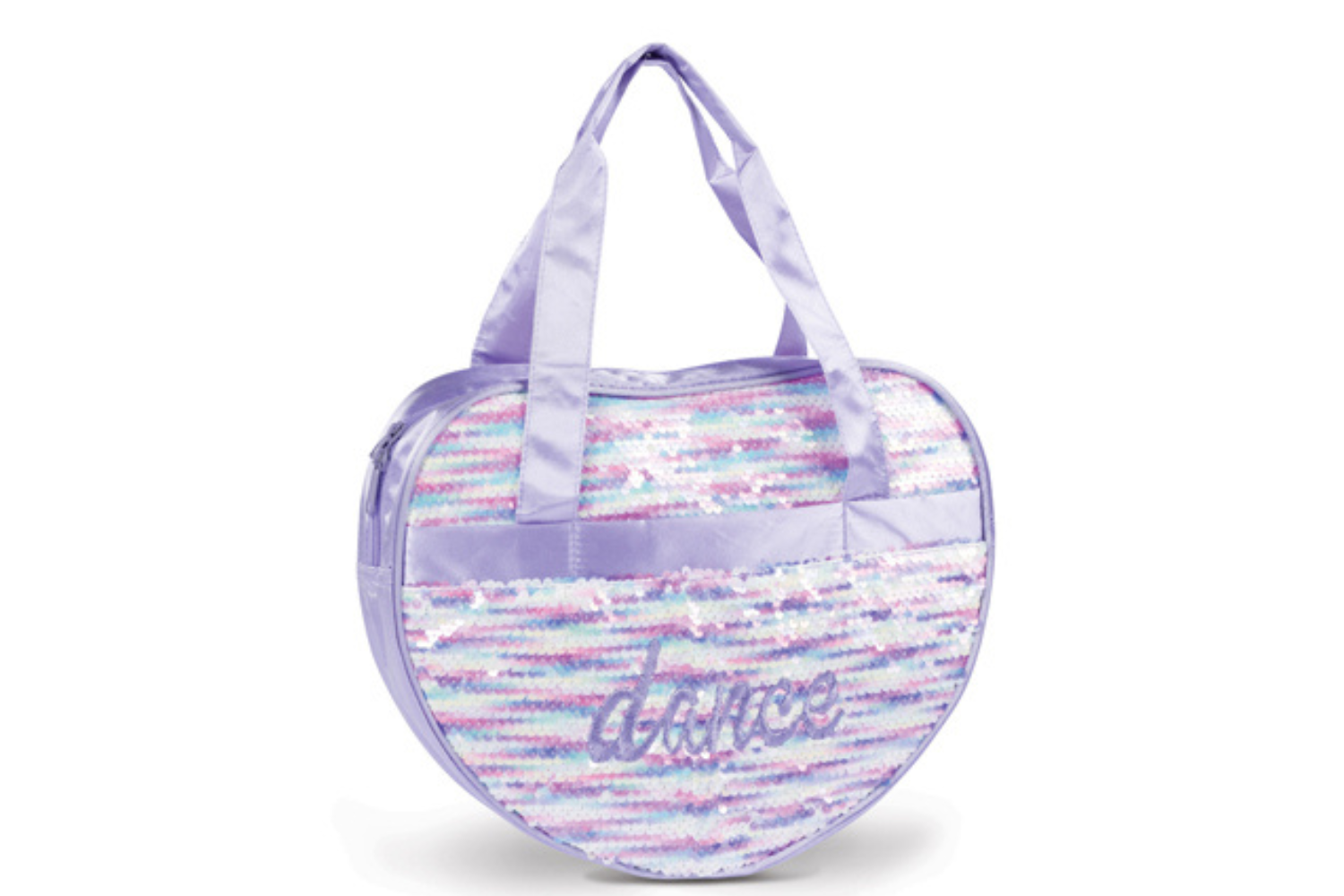Adorable lavender shimmering sequined heart tote, the sweetest dance bag for any young dancer.