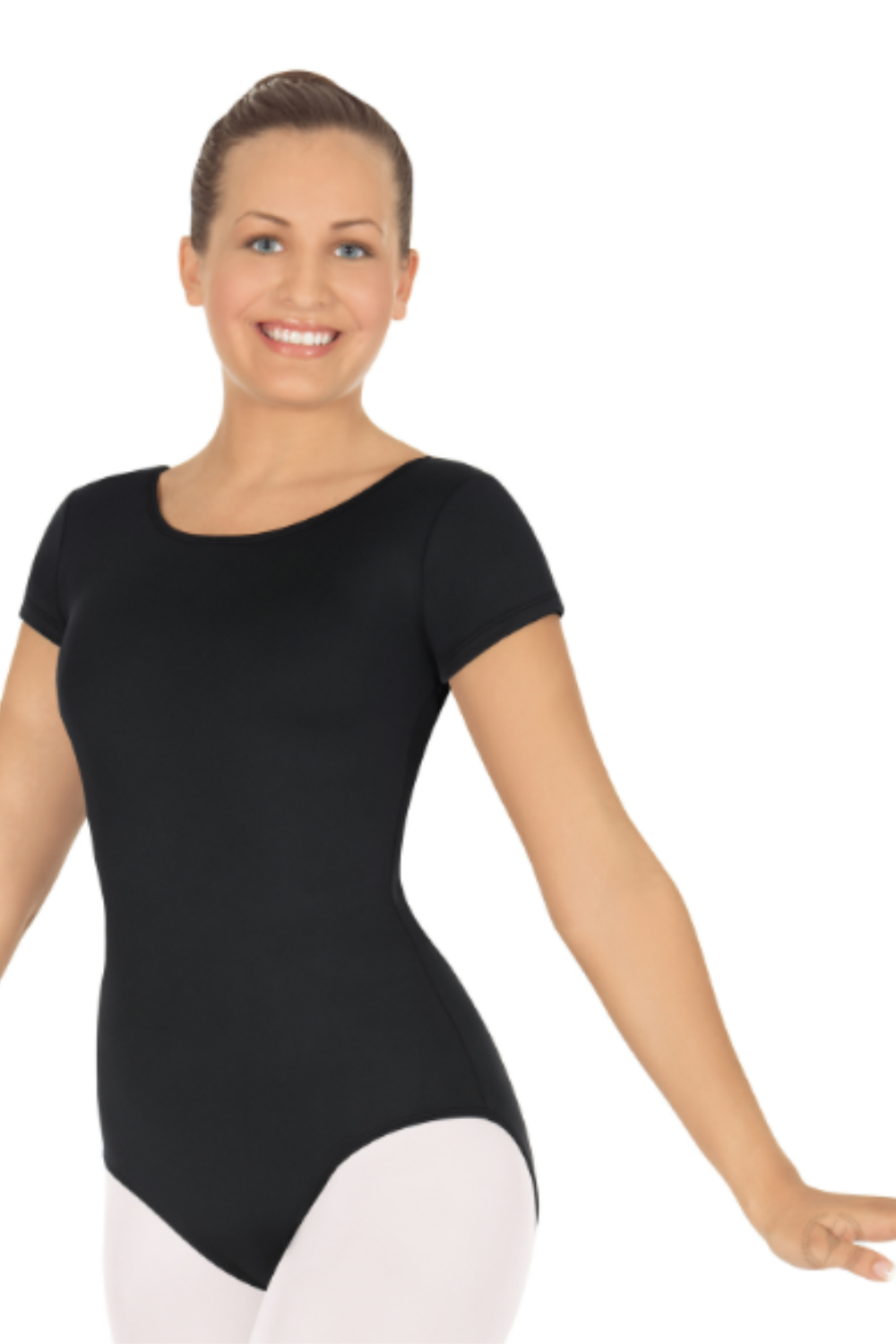 • This essential dance leotard features a moderate scoop neck, scoop back, and short sleeves.