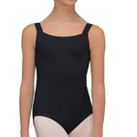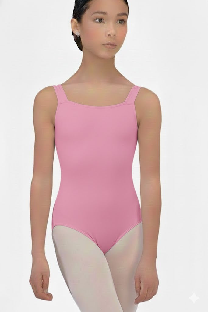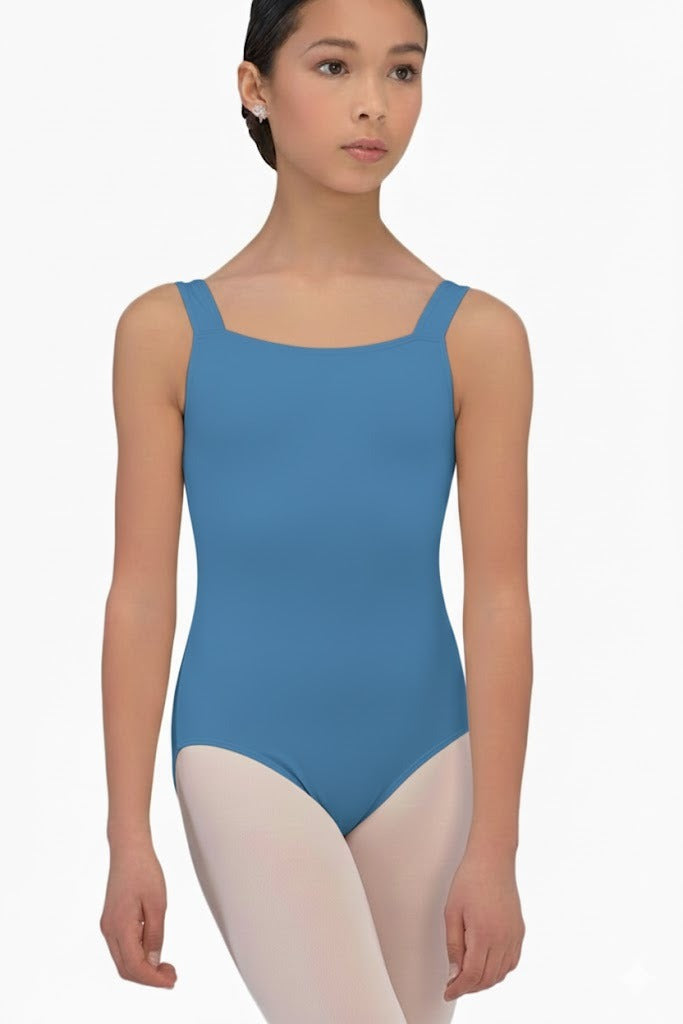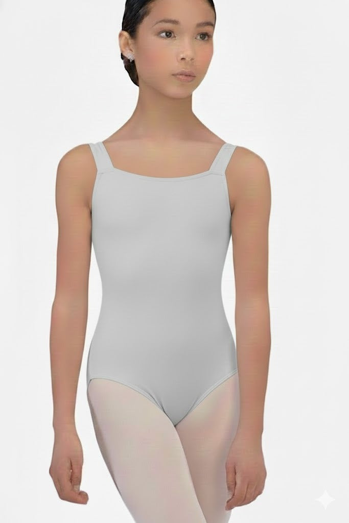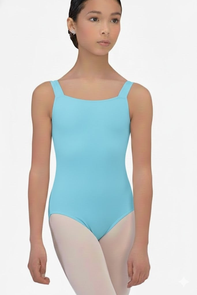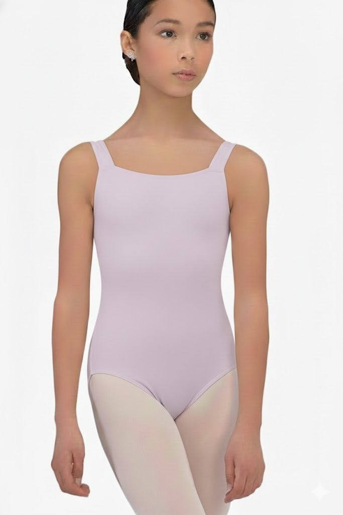 Elegant tank-style leotard featuring a refined square neckline that enhances a clean and classic silhouette. Designed with full front lining for added comfort and support. Crafted from high-quality microfiber, offering softness, flexibility, and a flattering fit for dancers.