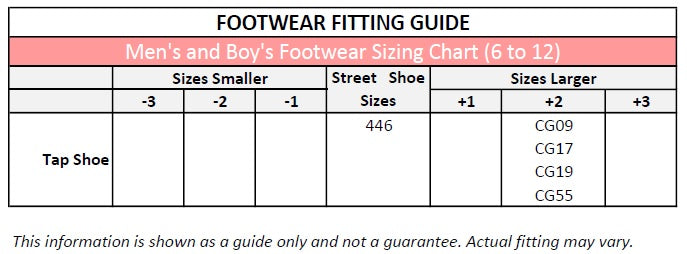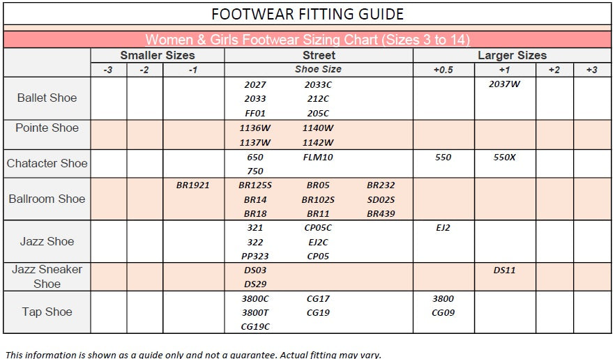 • Women: Begin with 1/2 - 1 size up from street shoe size. Men: Begin 2 - 3 sizes up from street shoe size.