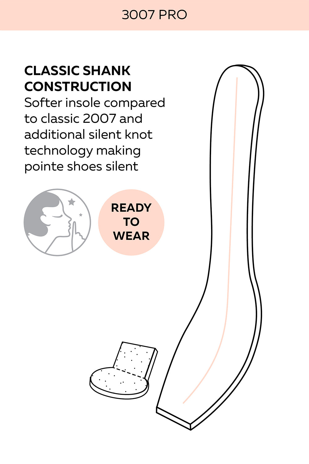 The model is similar to 3007 model with softer insole and additional silent knot technology, making pointe shoes silent