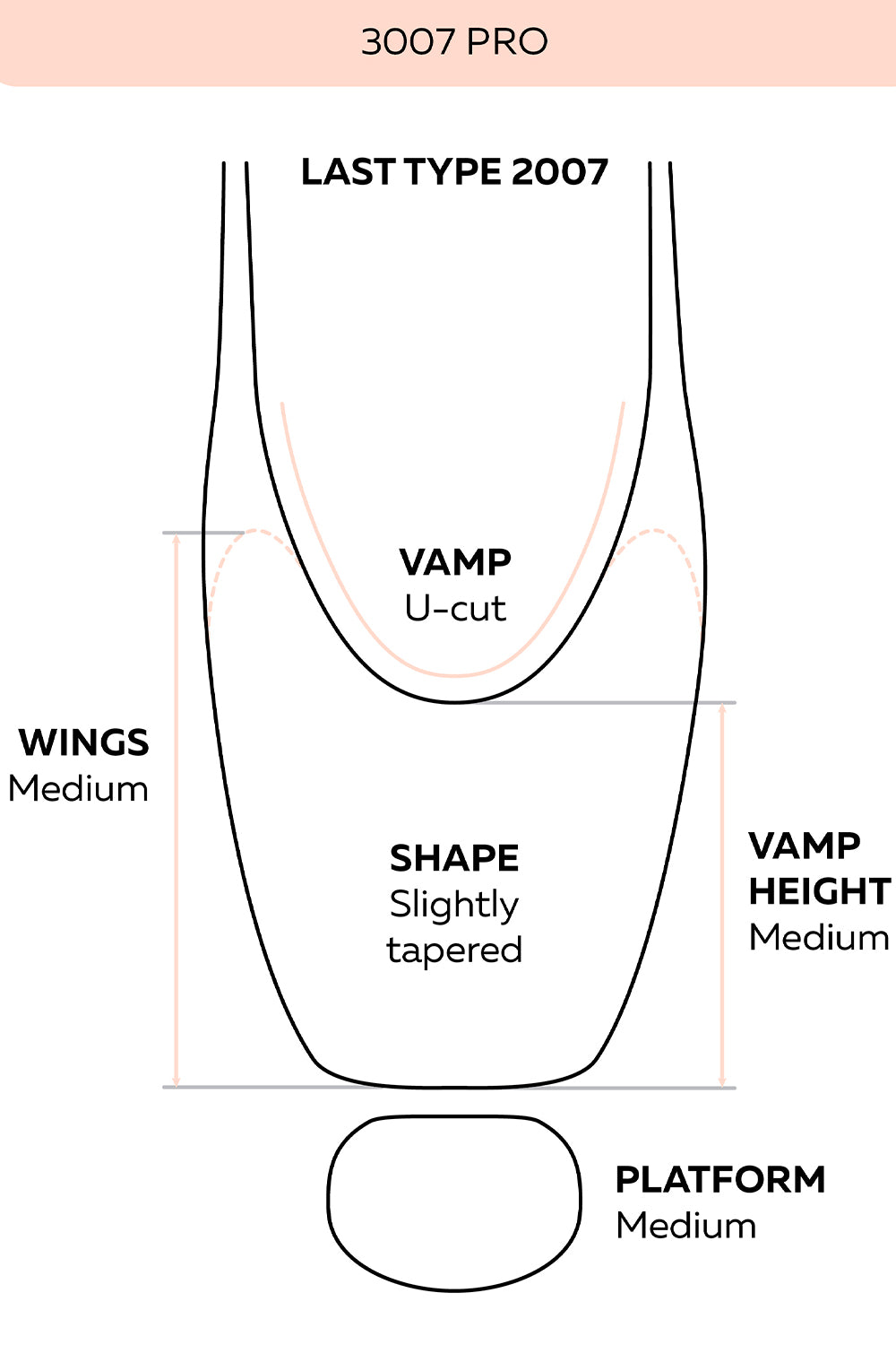 2007 is developed with consideration of anatomic features of the medium width foot with a medium arch with medium or long toes. This unique construction satisfies 90% of ballerinas. Therefore, Nikolay has the biggest part of their pointe shoe models based on the 2007 last. 2007 has a tapered dynamic form. It is one of those models, which creates that elegant classy look of ballet stars.