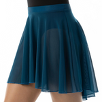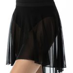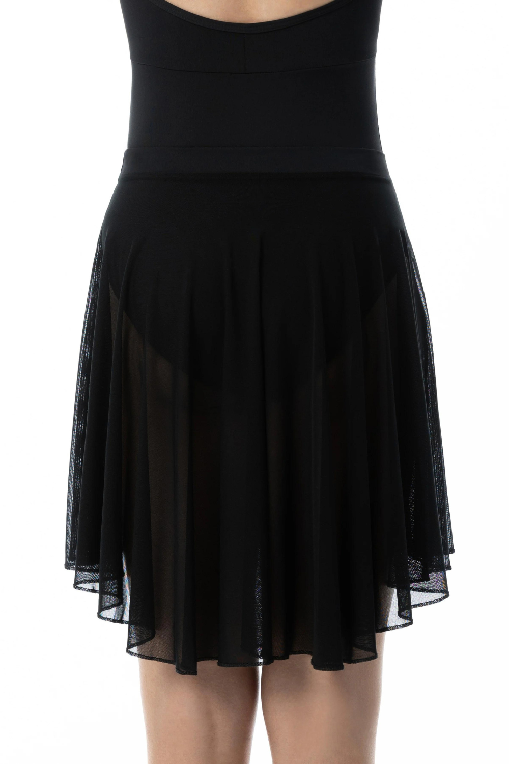 Midi length pull-on high low mesh skirt with fabric waistband.