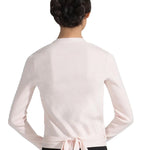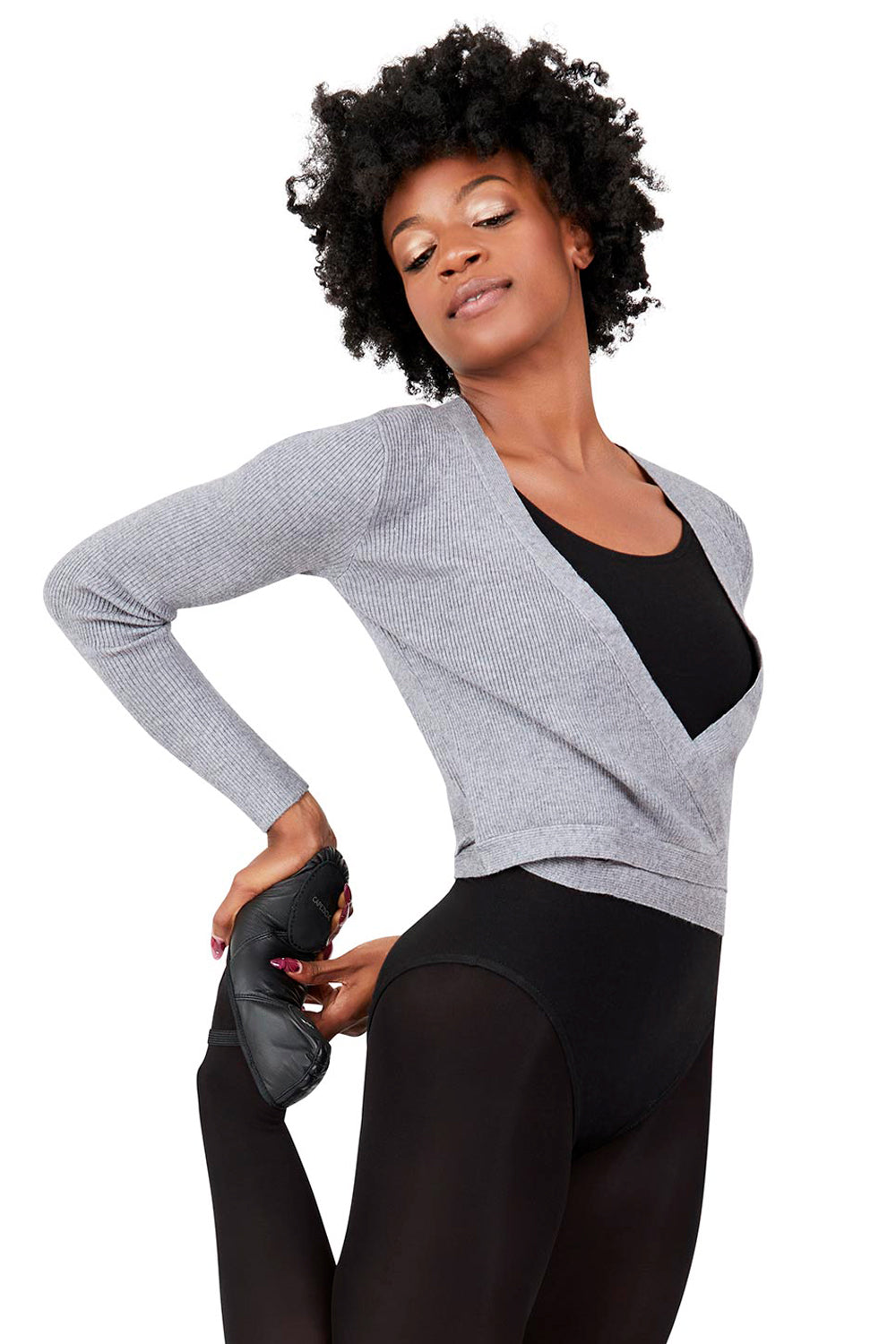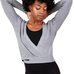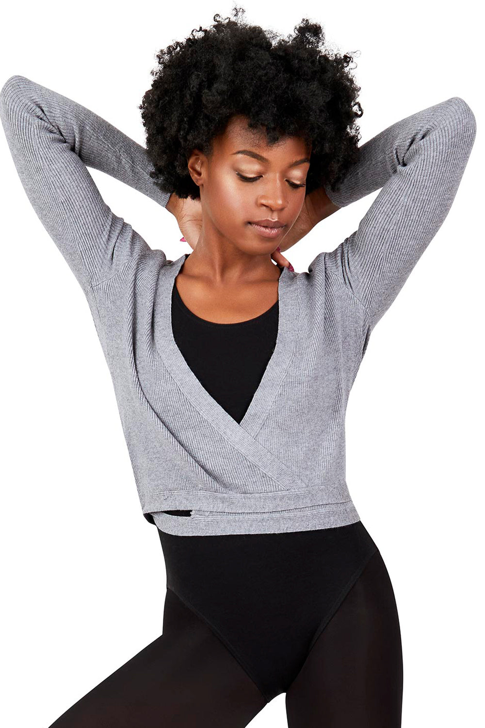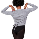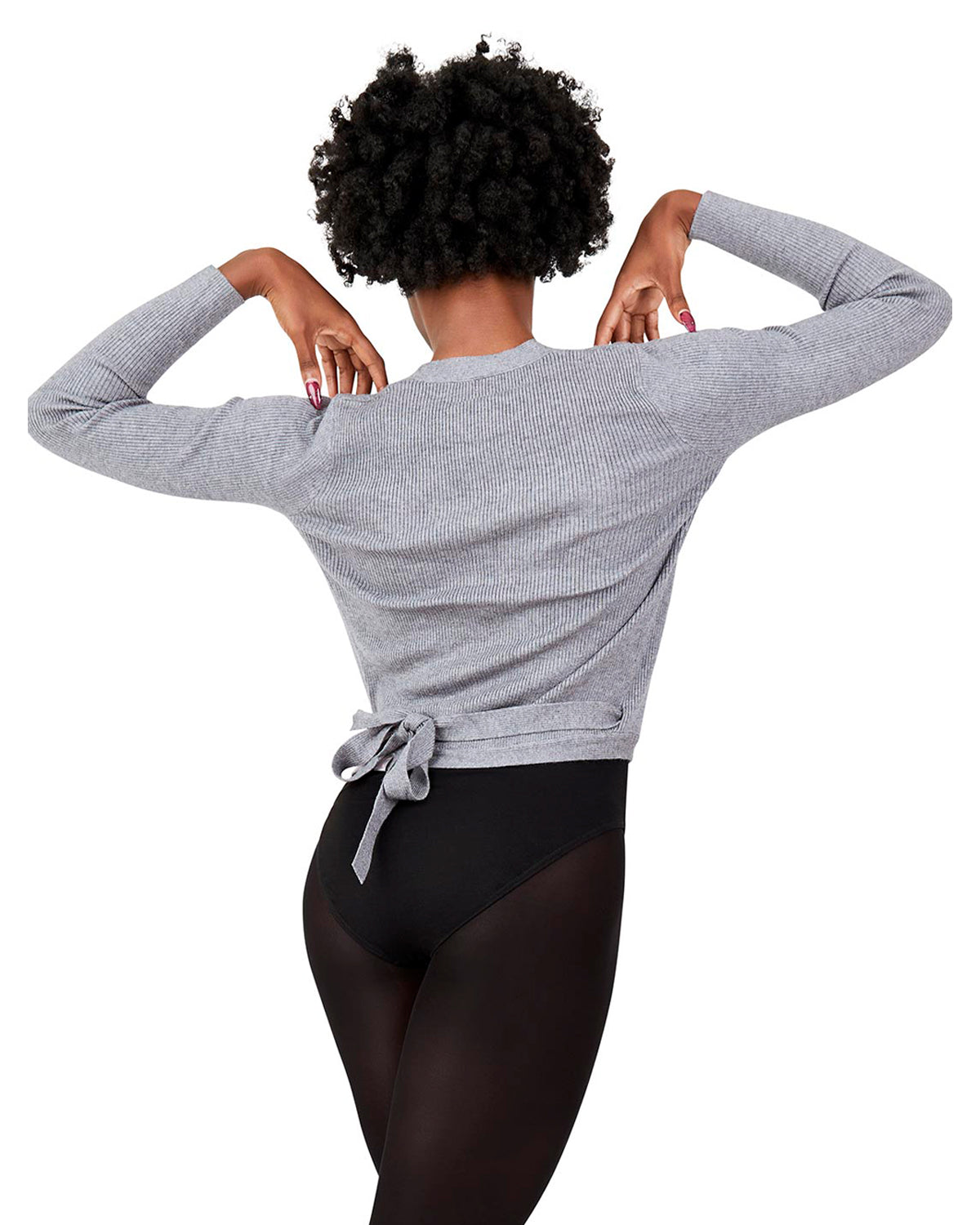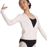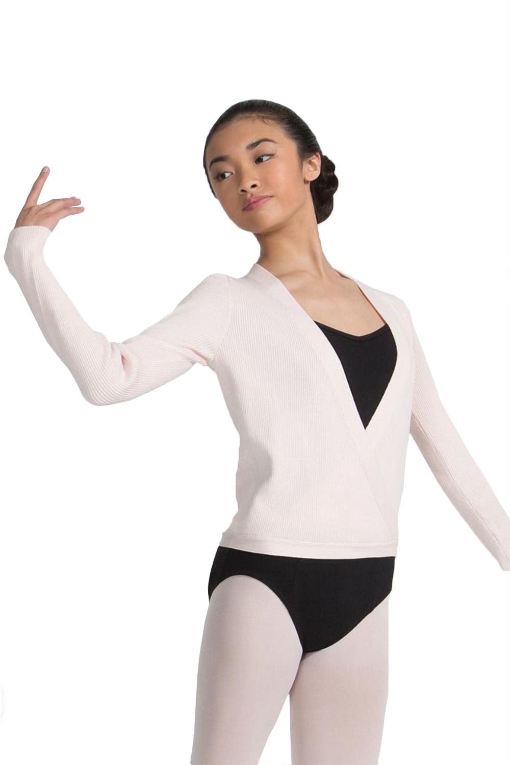 If your studio space runs a little cold, our Wrap Sweater is the perfect solution. Made of a soft knit blend. Features long sleeves and a self-tie for multiple tying options. Ribbing detail creates a fitted shape that highlights the dancer's form. Layer over leos or everyday wear to stay warm no matter where you are.