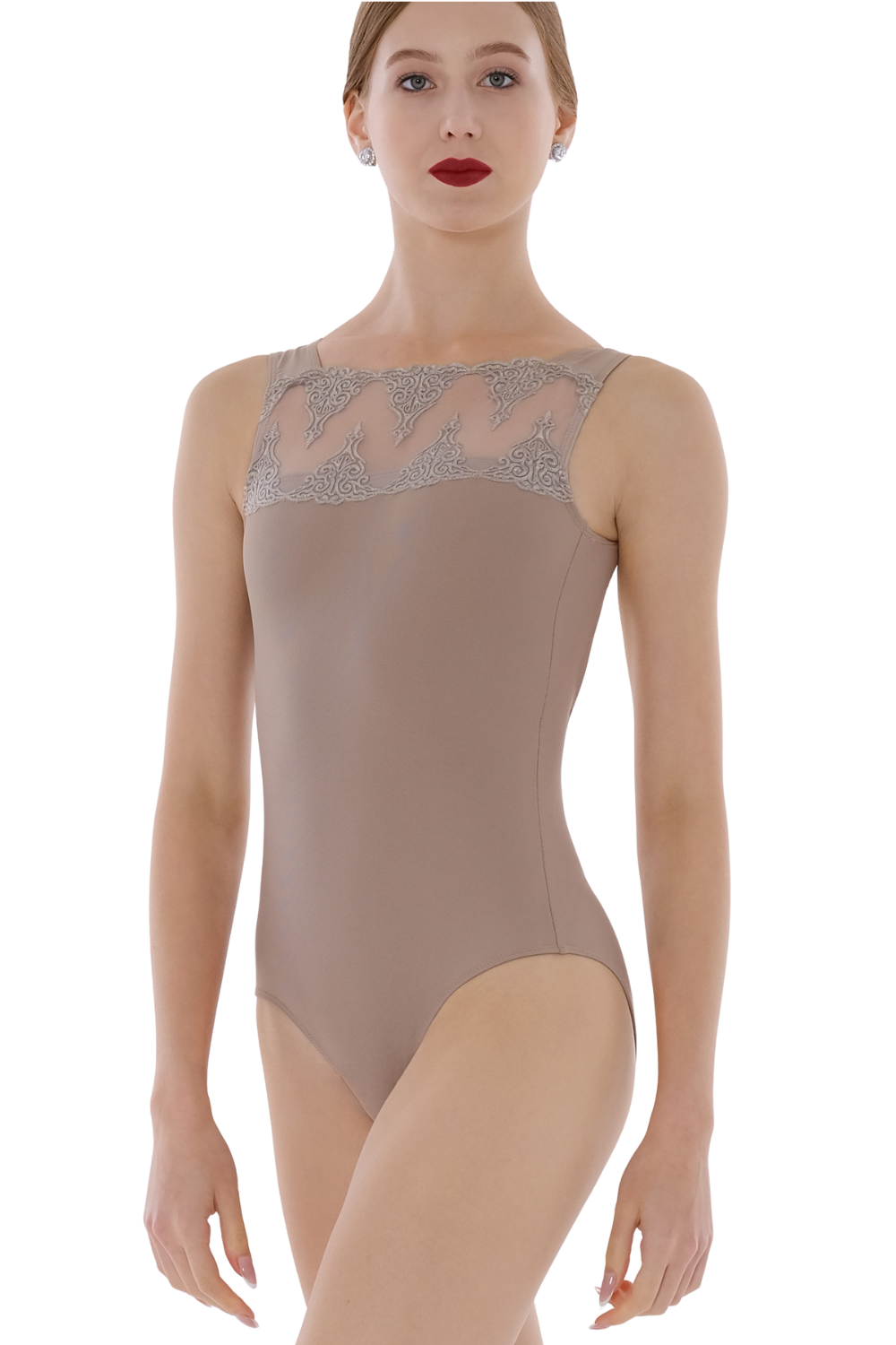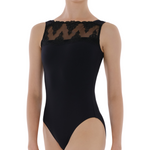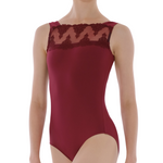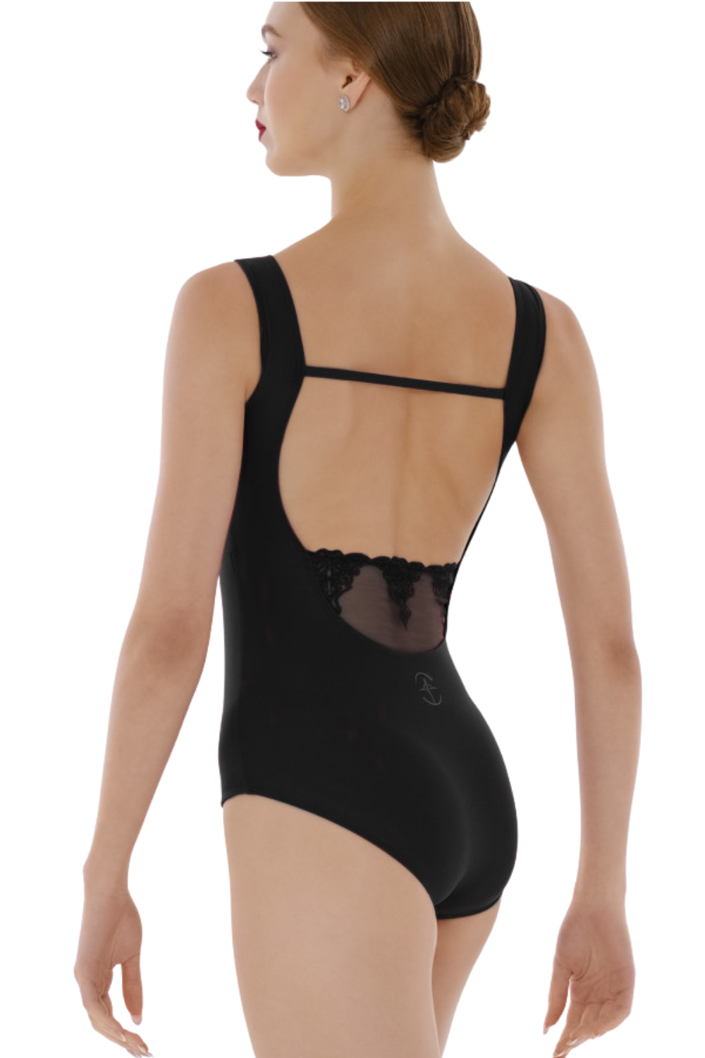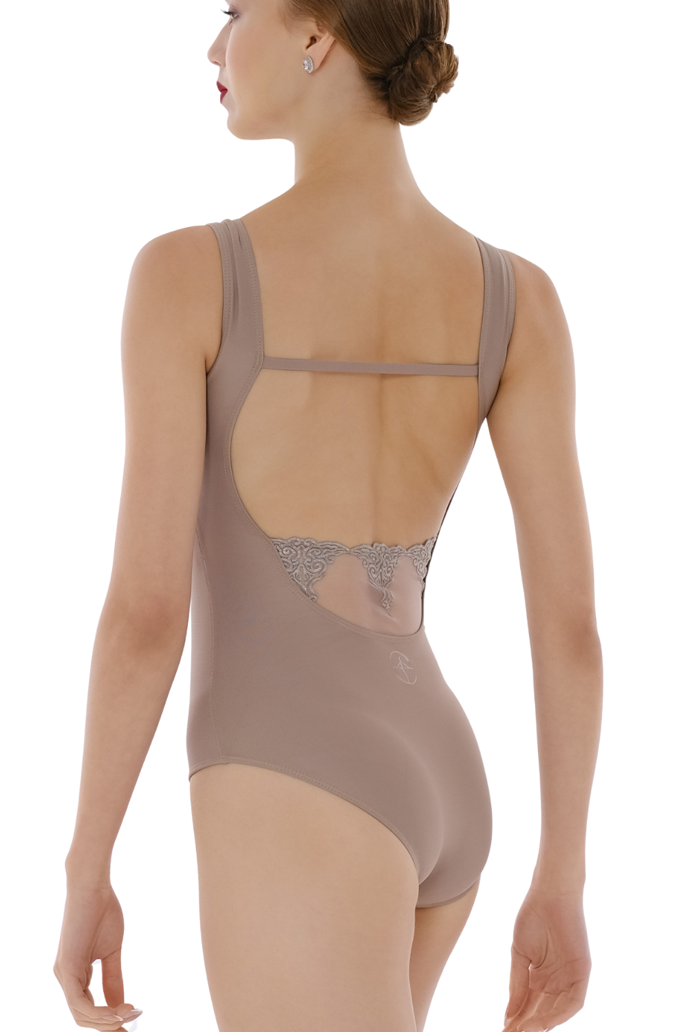 This two-fabric leotard has a boat neckline, accentuated by a wide scalloped edge of embroidered tulle. Its deep backline, highlighted by embroidery, enhances the dancer's back arch.