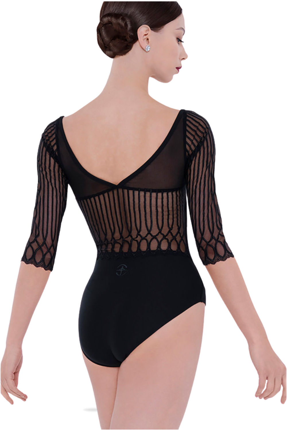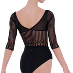 NEREA embodies elegant versatility. This leotard features a lined V-shaped tulle panel on the back, that transitions effortlessly into 3/4-length sleeves, combining style with practicality. Its unique see-through design enhances movement and grace. The sophisticated open-back detail with tulle accents brings a modern touch, making it a stylish and functional addition to any dancer’s wardrobe.