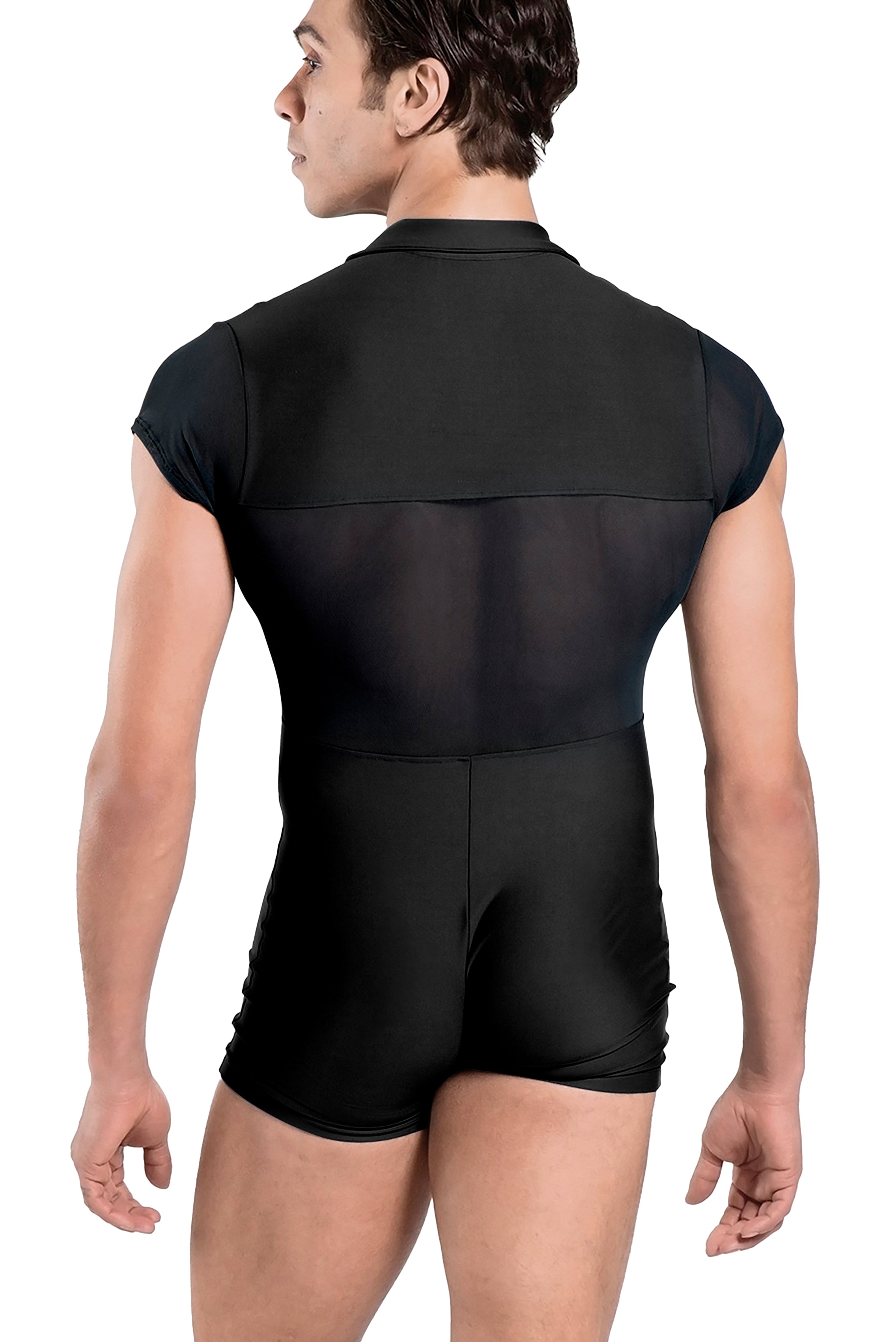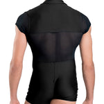 This unique men's fashion unitard incorporates the perfect blend of microfiber and four-way stretch mesh sleeves and back panel.