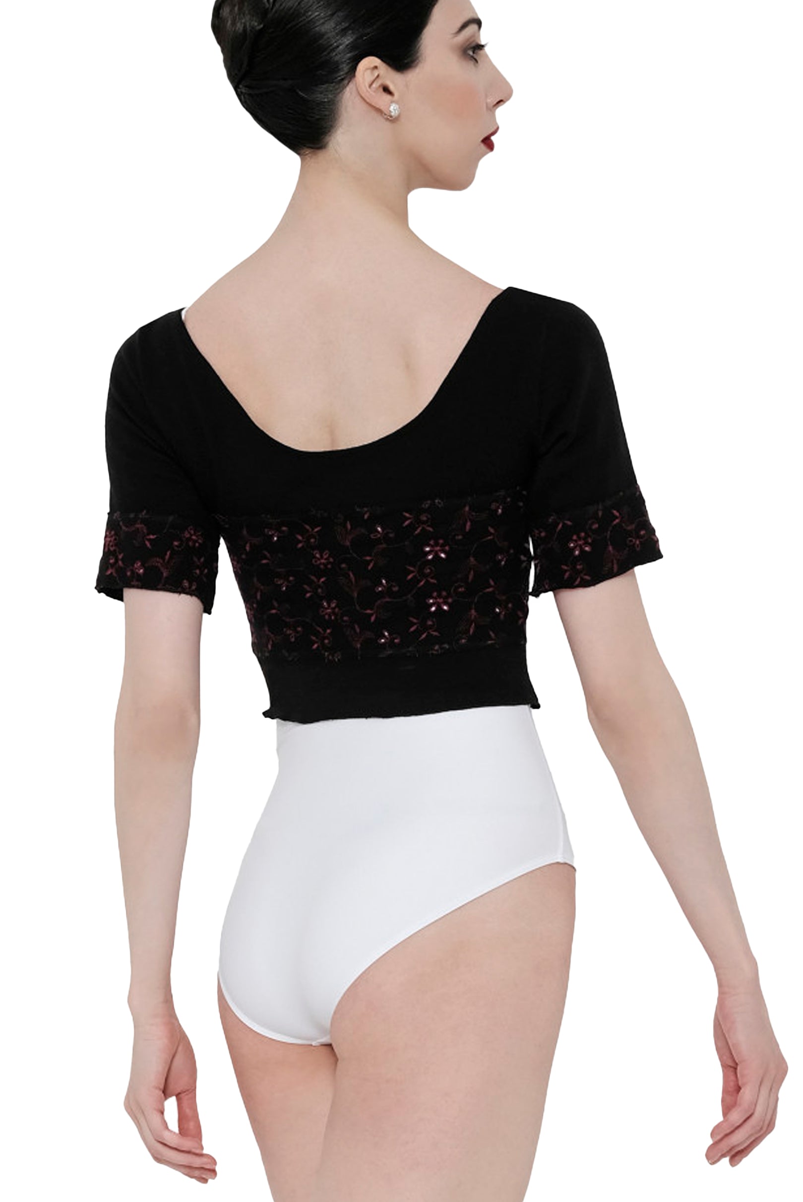 Short sleeve comfortable cropped top with an embroidered wool front band, back, and cuffs, highlighted by a beautiful wide scoop neckline.