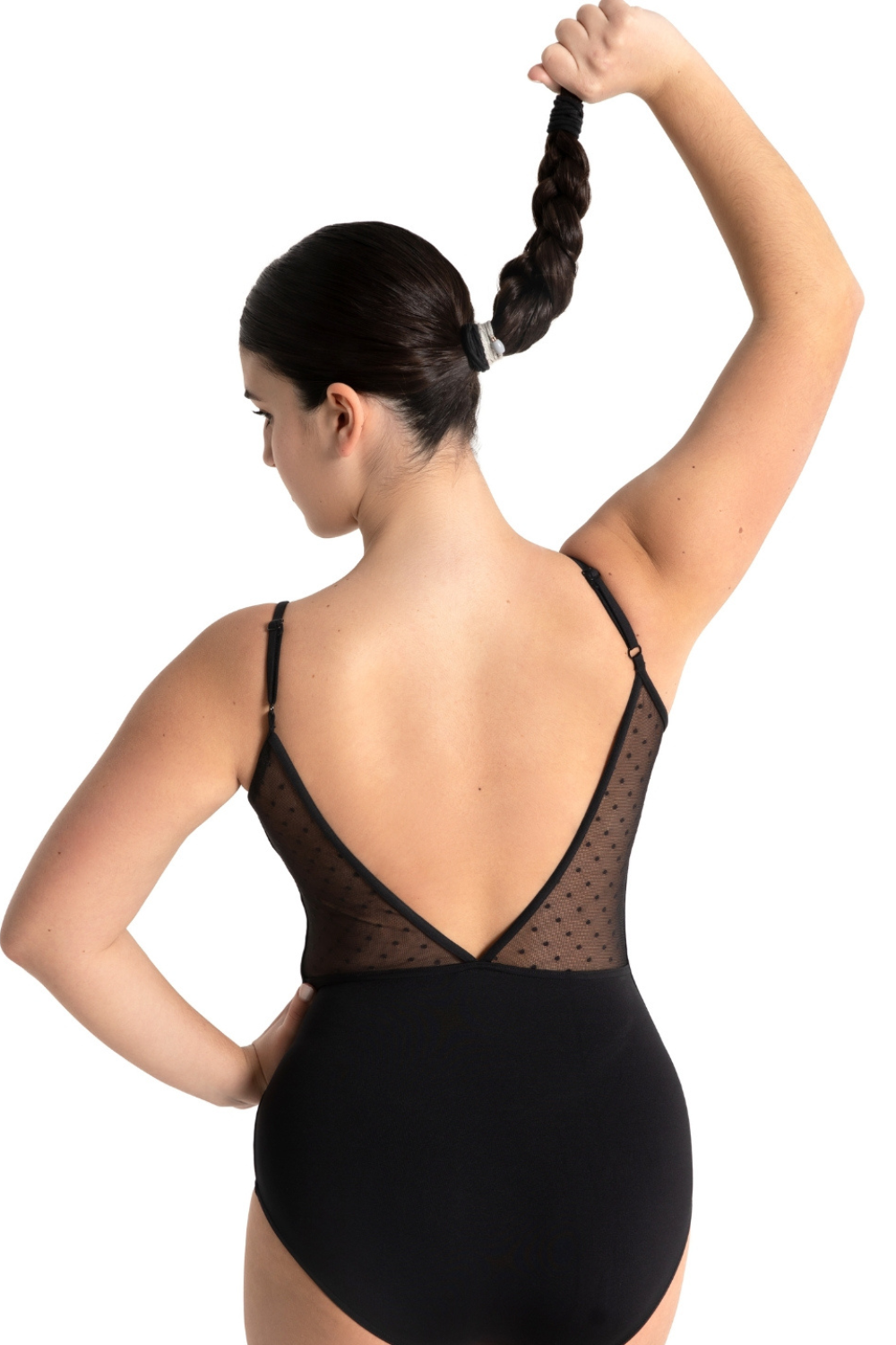 Your favorite Camisole Leotard just got an upgrade! Experience the classic fit of the Camisole Leotard with added polka dot detail. Mesh yoke and back for breathability and style. Deep v-back highlights key back muscles. Pair with Spot On Wrap Skirt to complete your look. Available in adult sizes only.