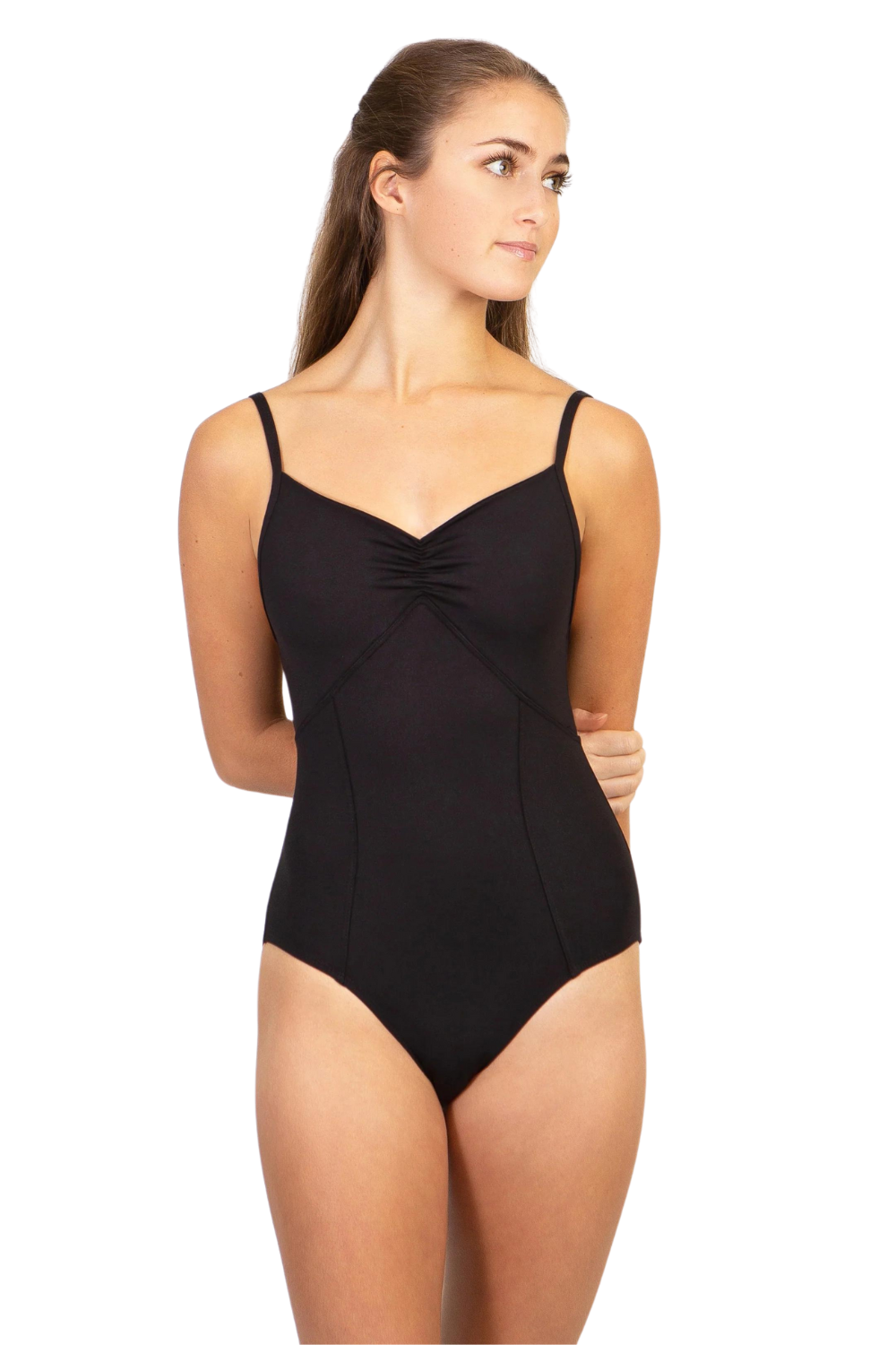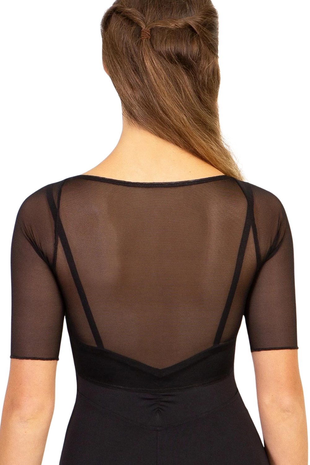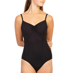 Pinch front sweetheart camisole leotard with princess seams and low pinch back and mesh sweetheart neckline half sleeve top.