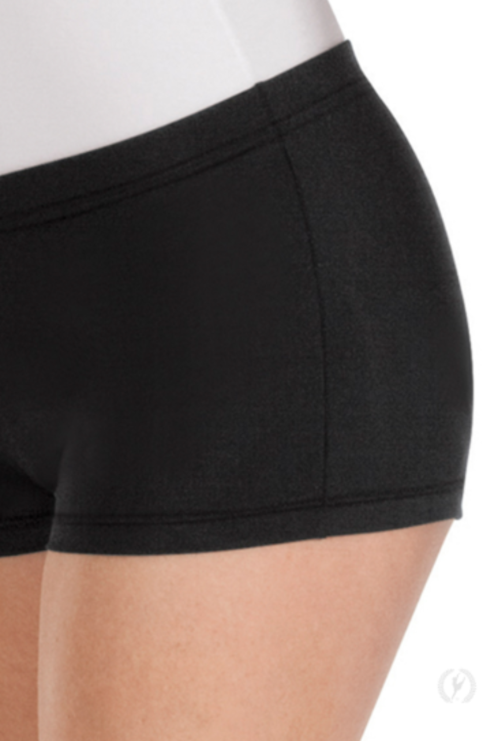 • Classic booty shorts with a covered elastic waistband that sits flat and straight along the hips.