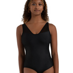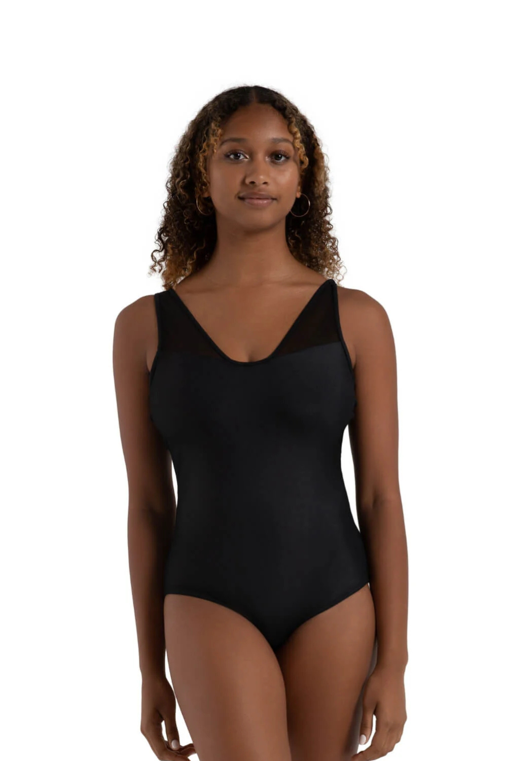 Introducing the Luisa Leotard from the Curved Rhythm collection. This stunning tank leotard features a graceful V-neck front and elegant V-back, perfectly complemented by dyed-to-match mesh panel straps with self-binding. Crafted from a blend of Nylon and Spandex, the Luisa Leotard offers unparalleled flexibility and comfort. All colors are fully front-lined design and feature a ballet leg line, this leotard ensures both style and support for every dancer's performance. Available in adult sizes only.