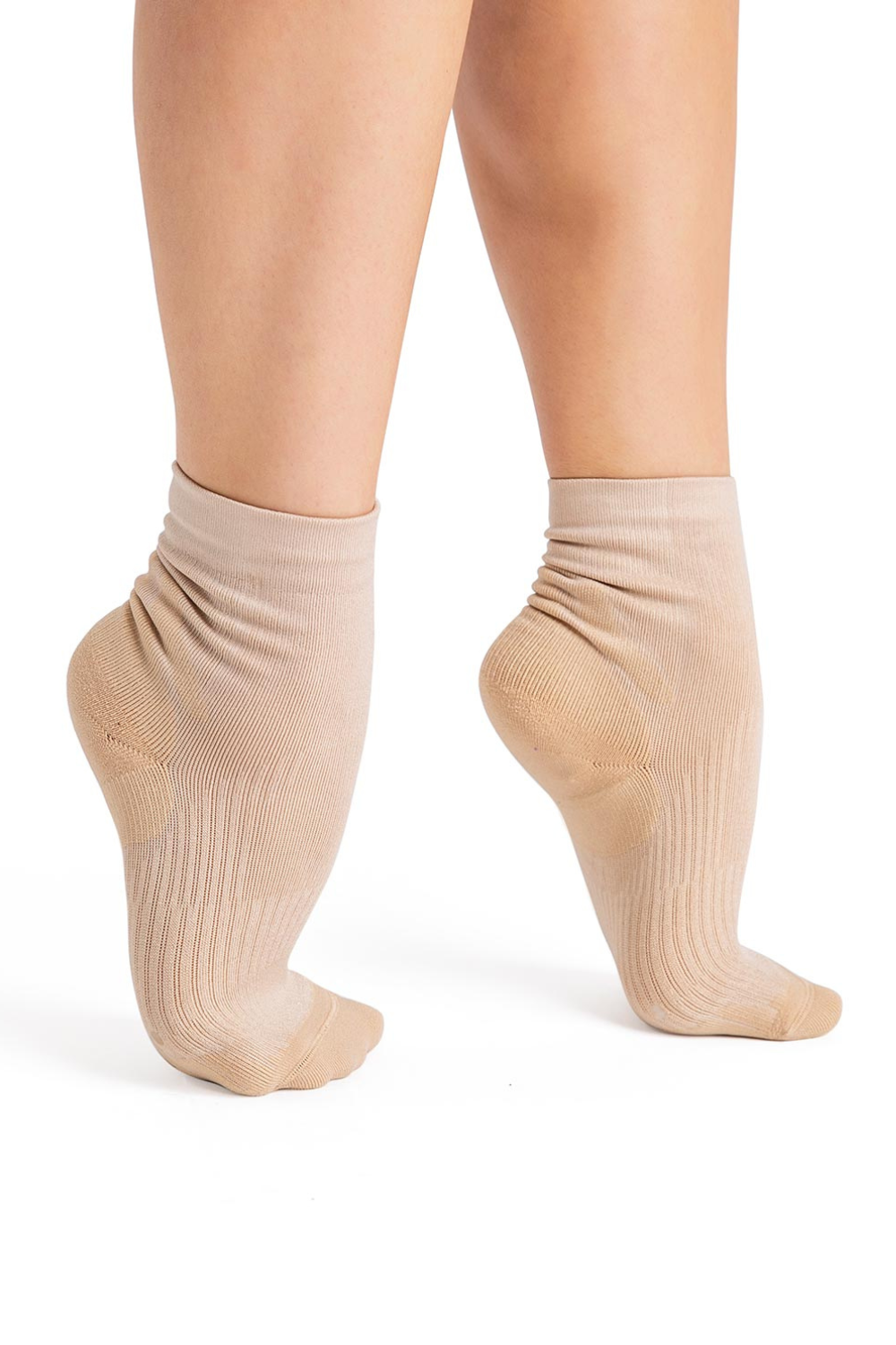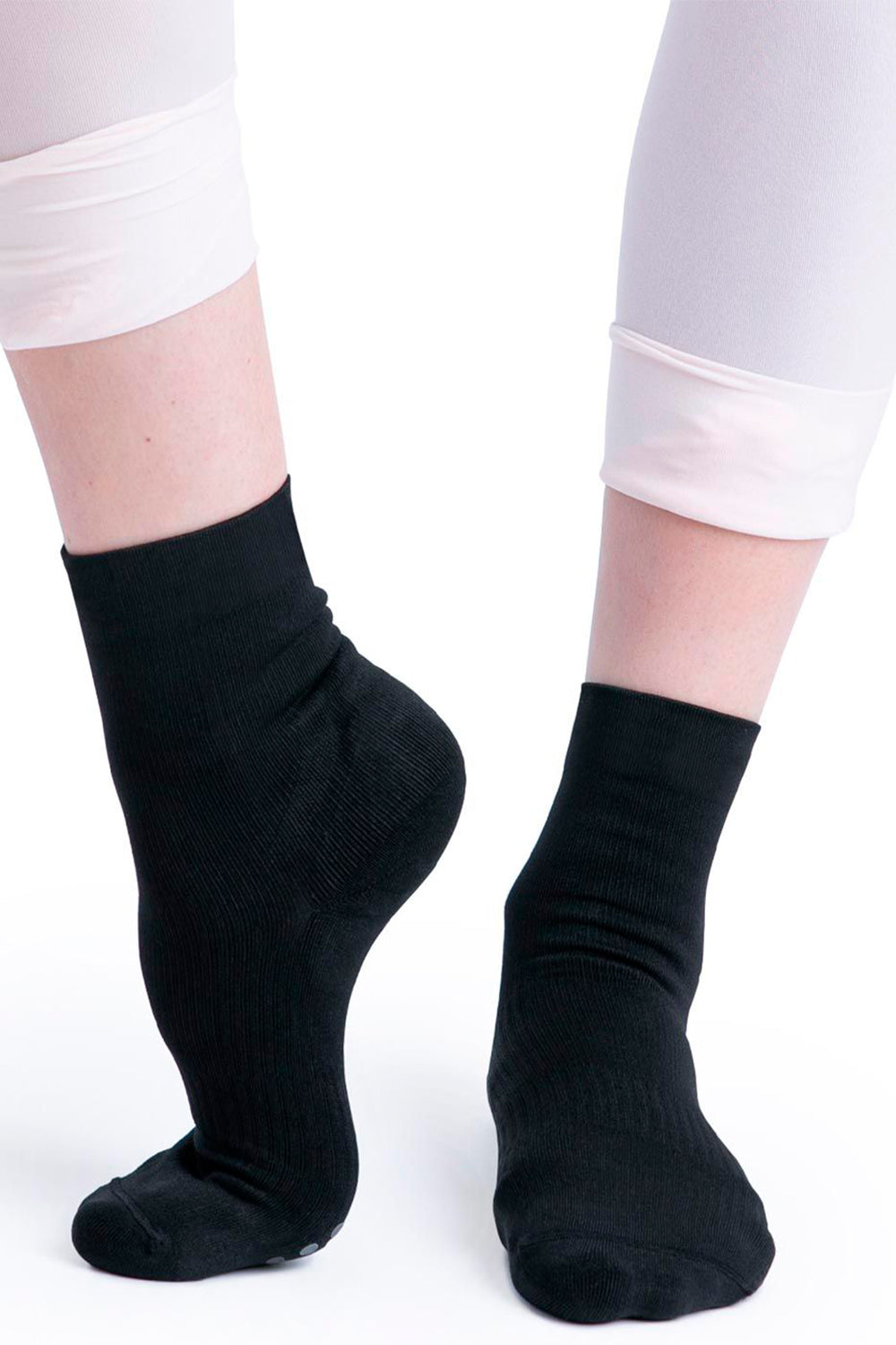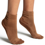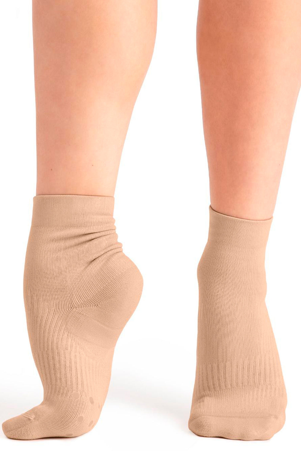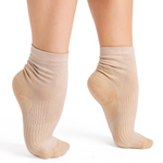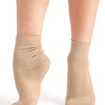 Ideal for dance, training and recovery, this ankle sock prioritizes comfort, support and compression. Strategically placed compression points within the sock reinforce and lift, while the durable cushioning absorbs shock to improve performance. Wicking yarn enhances moisture ventilation and overall breathability.