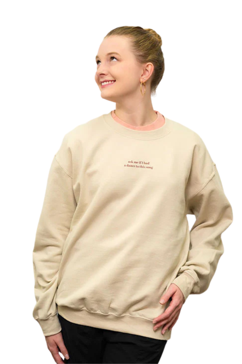 Soft, breathable, and effortlessly cute, this light-tan colored sweatshirt is perfect for dance class, road trips, or casual days when you want to subtly let everyone know you’re a dancer.