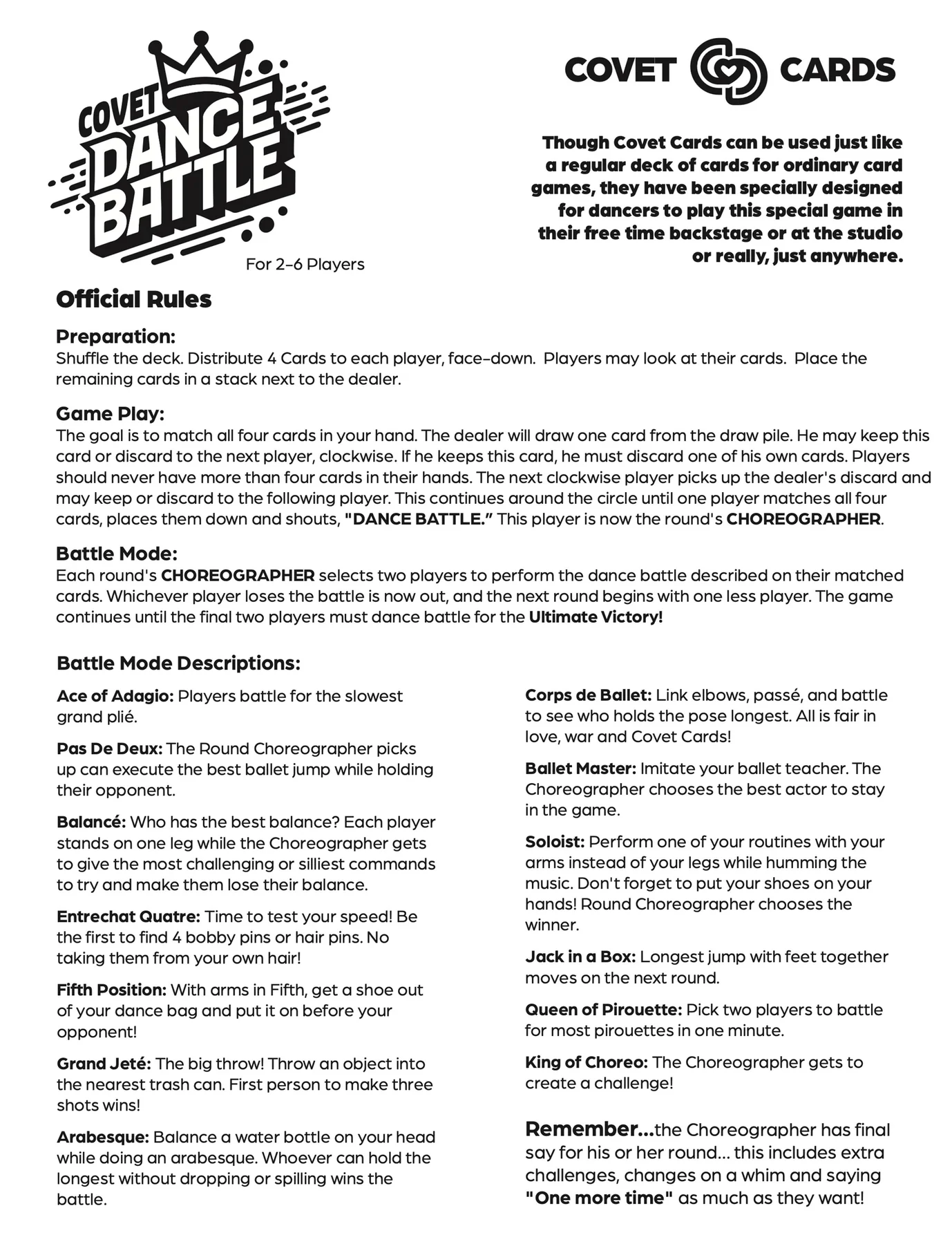 Though Covet Cards can be used just like a regular deck of cards for ordinary card games, they have been specially designed for dancers to play this special game in their free time backstage or at the studio or really, just anywhere.
