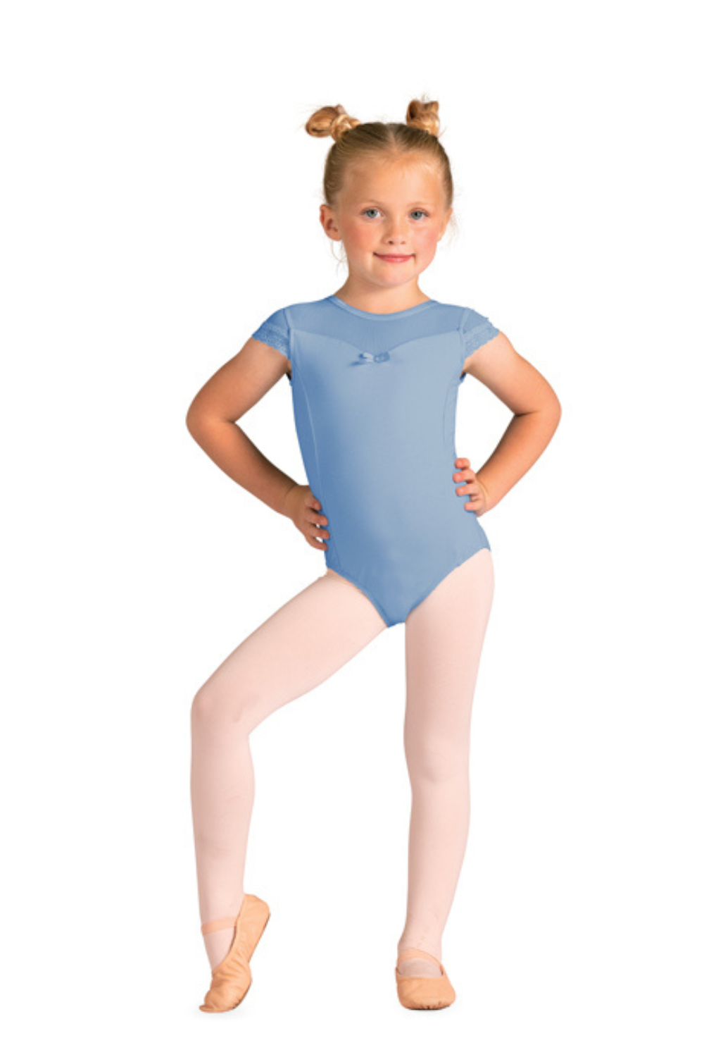 Cap sleeve leotard featuring mesh yoke and sleeves, scallop lace trim at sleeve opening and tack-on bow at center front of sweetheart neck.