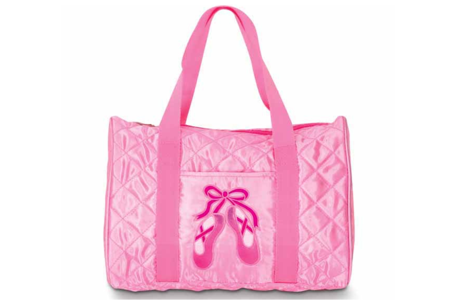 • Quilted diamond pattern satin duffel with contrasting pink stitch.