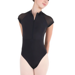 • Microfiber high mock neck leotard with a zipper front, breathable stretch mesh cap sleeves, a gorgeous open back and a high cut leg line.