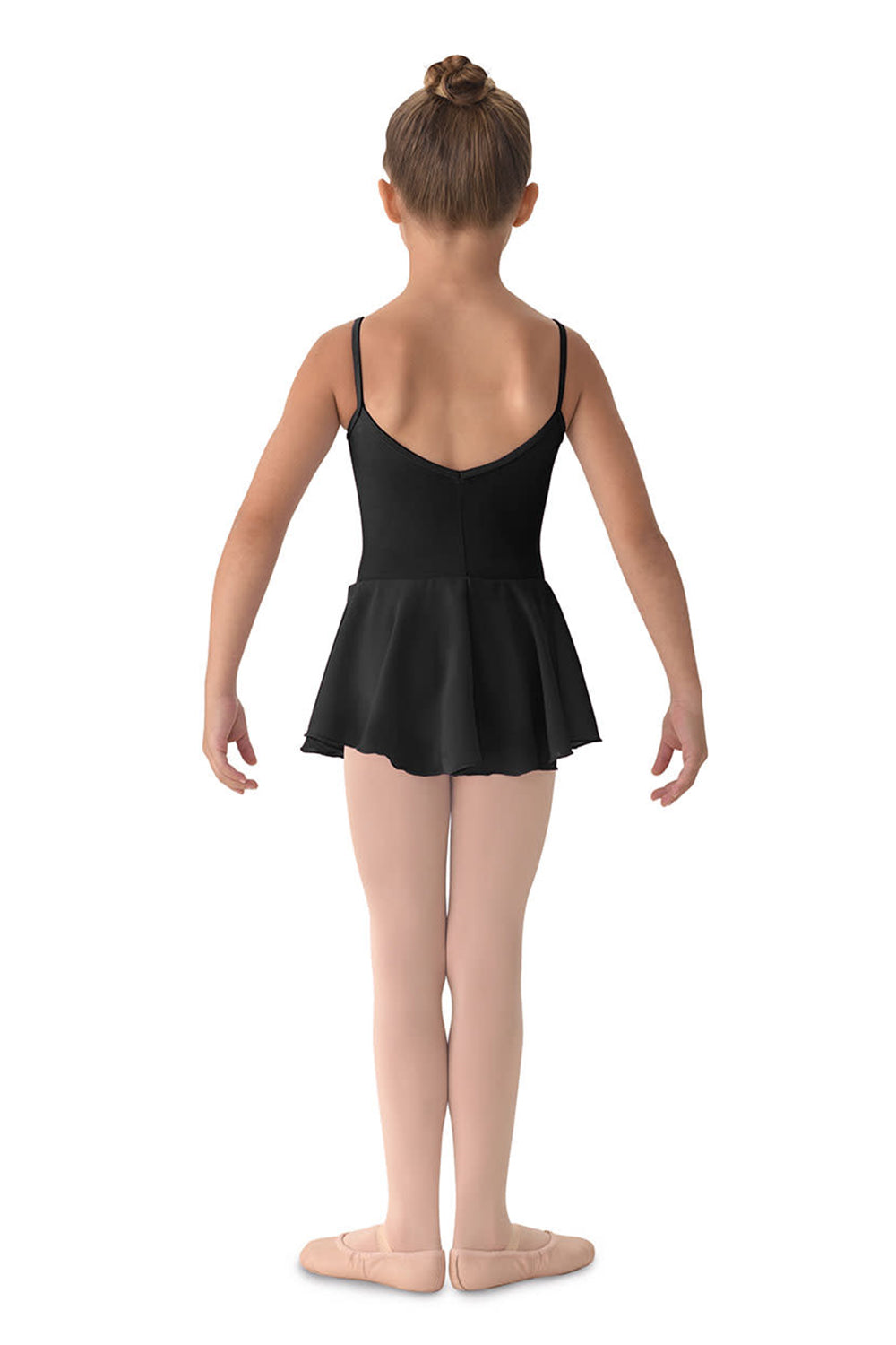 This darling camisole dress is a recital and performance favorite! A simple scoop front neckline is complemented with a V back which flatters the body and creates a beautiful line. An attached skirt falls from the hips to the upper thigh in a soft and flowing Georgette fabric.