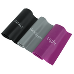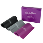 Stay in style while exercising your feet, limbs and core with this set of RP Exercise Bands in three strengths. Each band is 47 inches long and 6 inches wide, with the RP logo. Each strength is a different color: purple for light resistance, grey for medium resistance, and black for strongest resistance.
