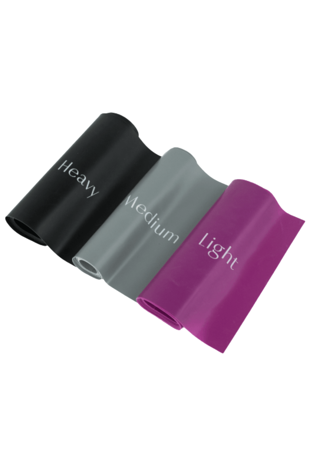 • Set of 3 resistance strengths: Light (purple): 4.5 lbs, Medium (grey): 5.5 lbs, Heavy (black): 8 lbs.